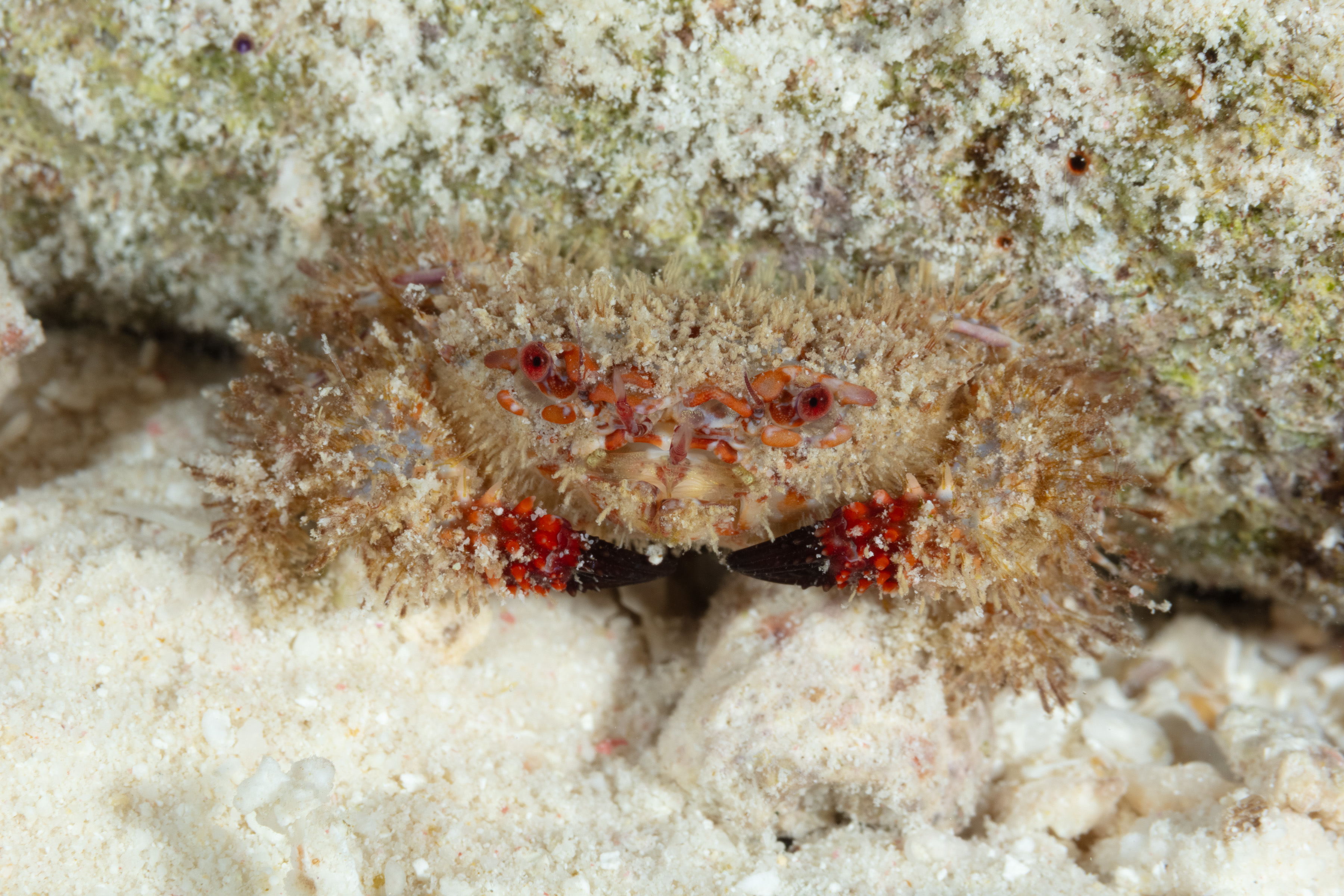The Longspine Hairy Crab has a very hairy body and legs. Its arms are deep red and covered with short spines, and the claw tips are black.