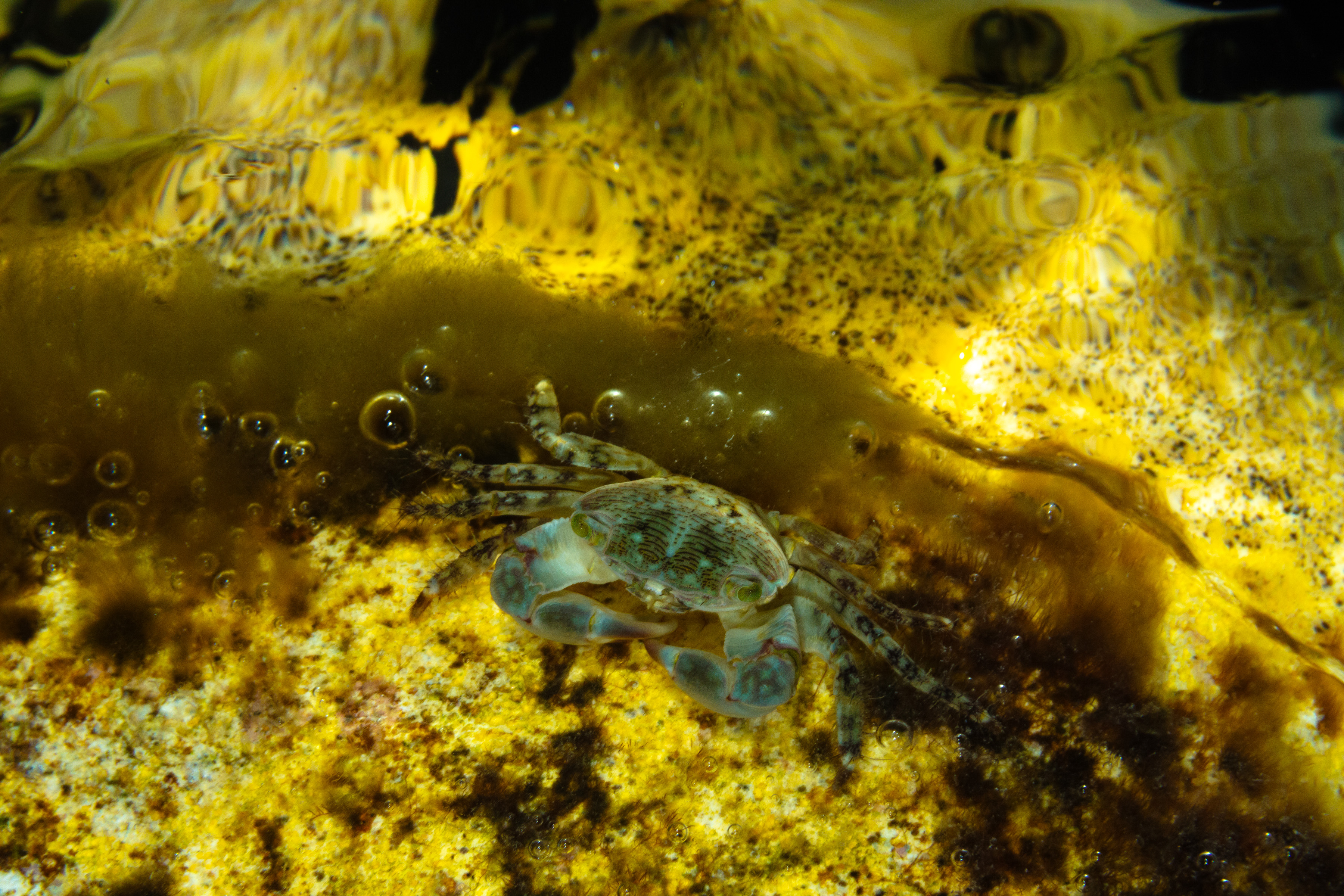 The Mottled Shore Crab can be found along rocky tide lines or on pier pilings.