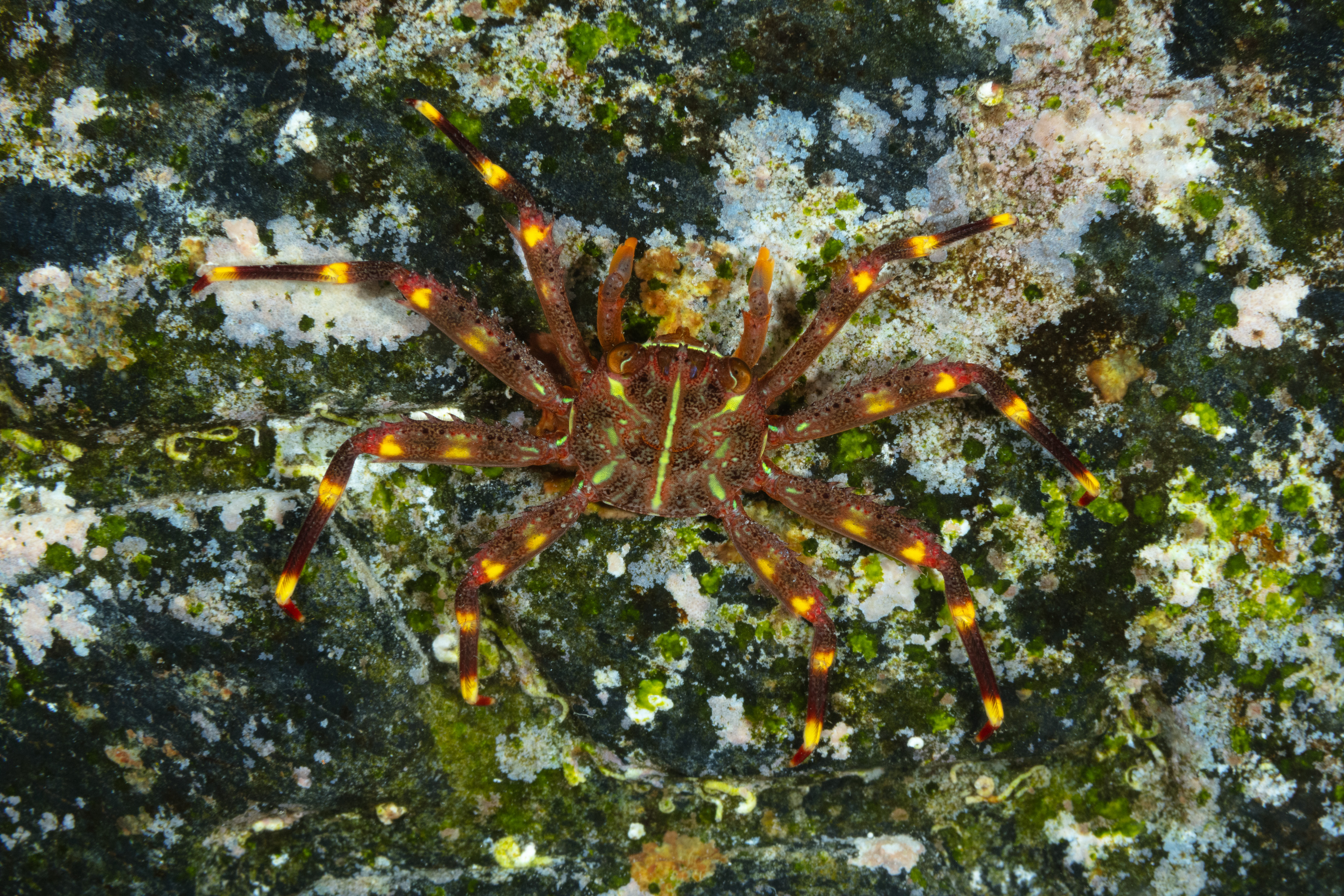 The Nimble Spray Crab can be found on rocky rubble or taking shelter beneath Long-Spined Urchins.