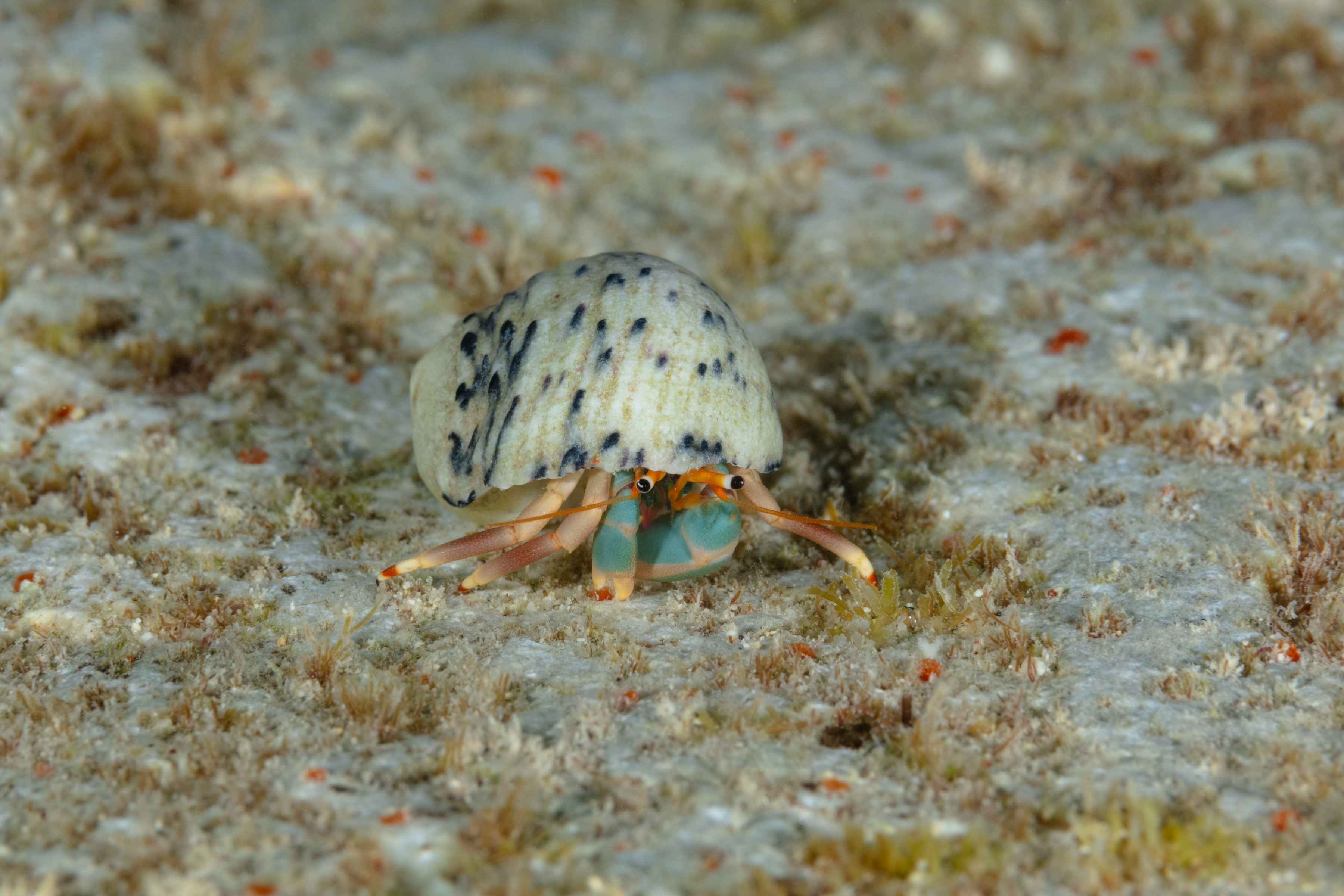 This Hermit Crab has claws with bright orange tips and eyestalks that are orange with white tips. Its claws and legs vary in color from dark red to light brown, and sometimes the claws may appear light blue.