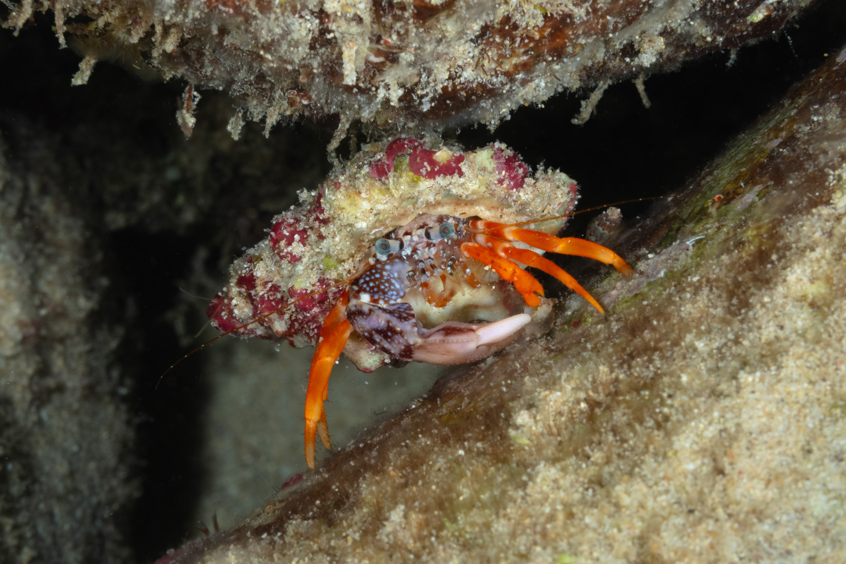 This Hermit Crab has a large right claw with spots resembling polka dots, vibrant orange legs, and blue eyes on banded eyestalks.