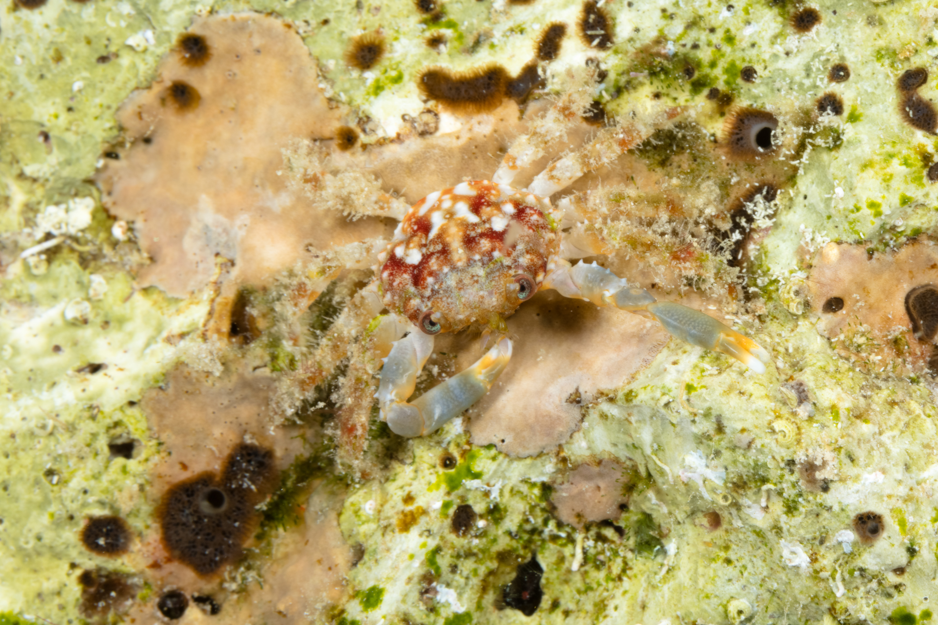 This small Crab has a flattened red carapace with white markings. Its legs are banded in orange and white, and its smooth claws have white tips.