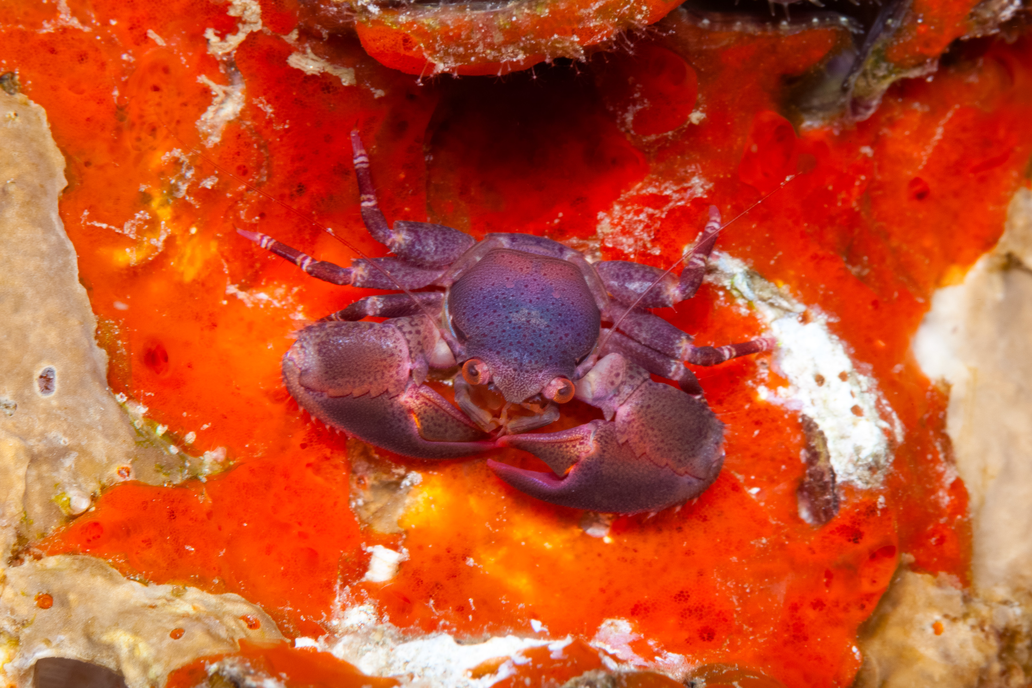 This small Crab has a reddish or purple body with scattered dark spots. Its walking legs have thin bands, and the claws are noticeably large.