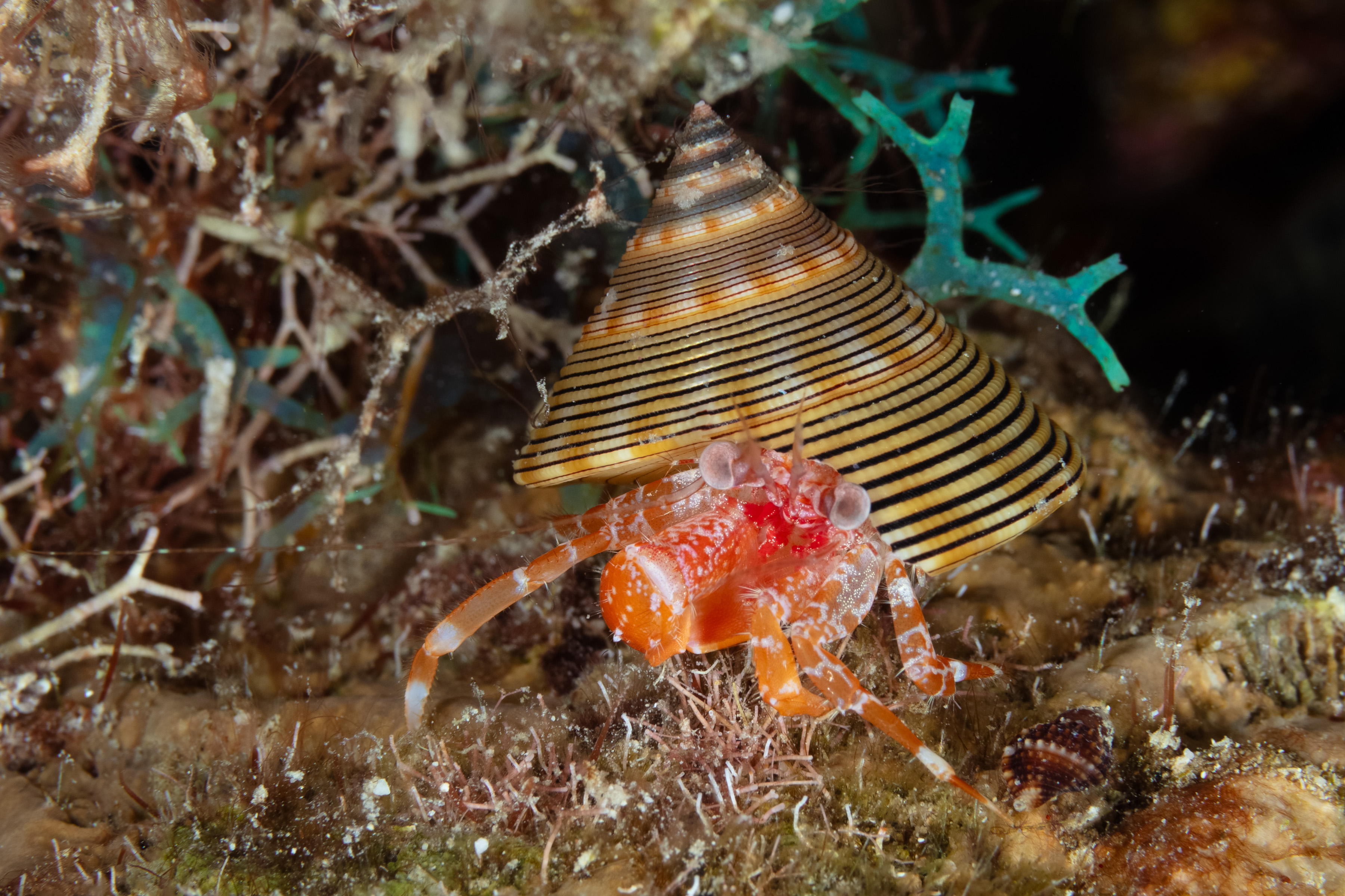 This Hermit Crab lives in empty shells and moves slowly. It is usually seen alone and quickly pulls back into its shell when disturbed.