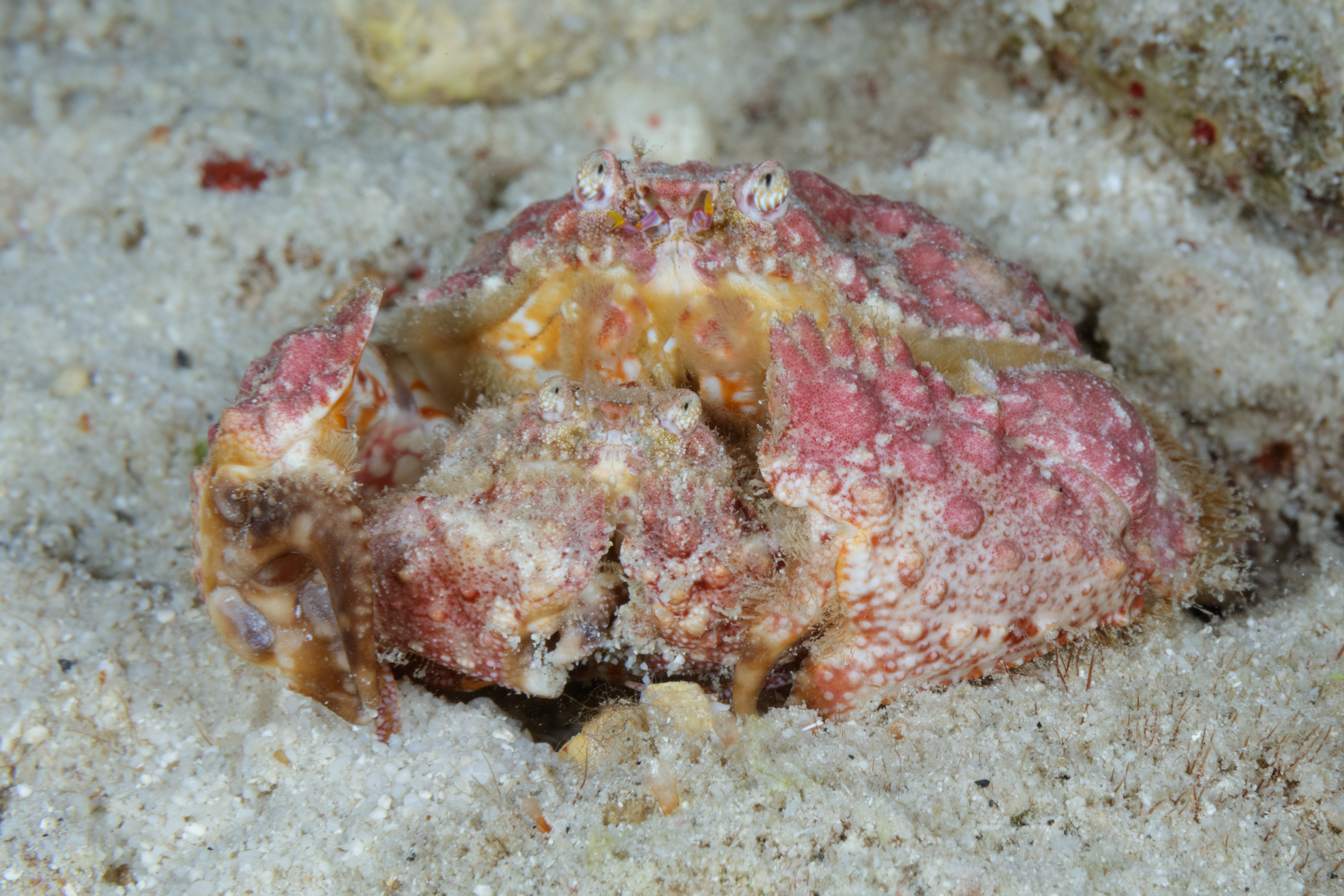 This Box Crab has a lumpy carapace in a variety of colors, including yellowish-brown, green, or sometimes even pink, with a ridge above the claws that looks like teeth.
