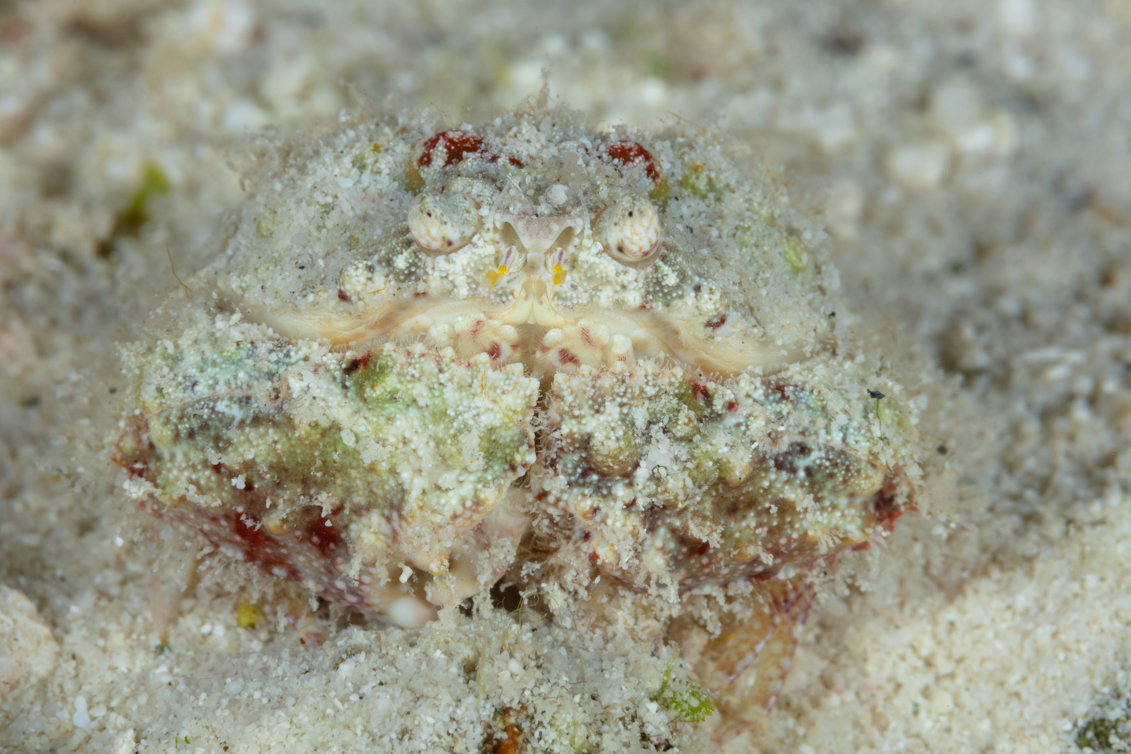 The Rough Box Crab buries itself in the sand, blending in with its surroundings.