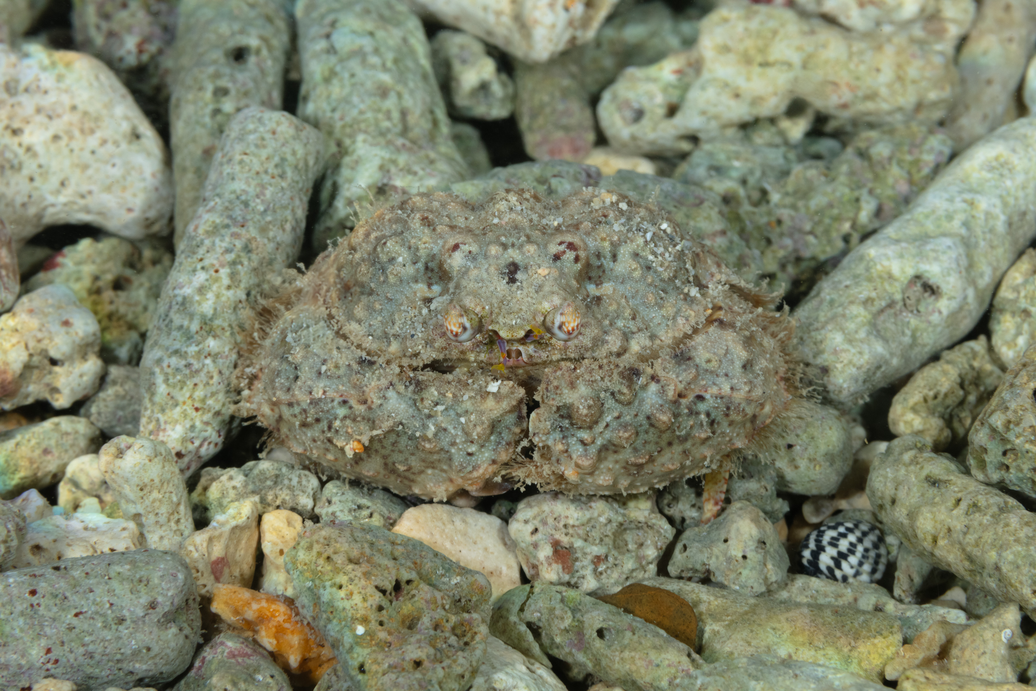 This Box Crab has a lumpy carapace in a variety of colors, including yellowish-brown, green, or sometimes even pink, with a ridge above the claws that looks like teeth.