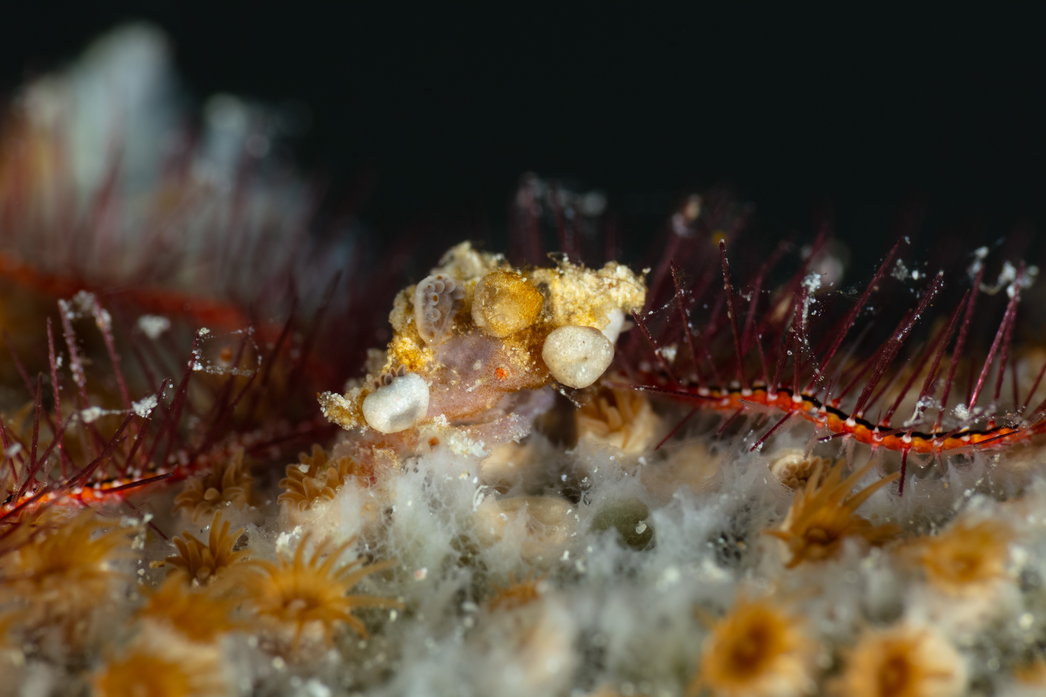 This Crab has a triangular carapace that is often decorated with sponges and other materials. It can have a variety of colors, often matching the decorations.