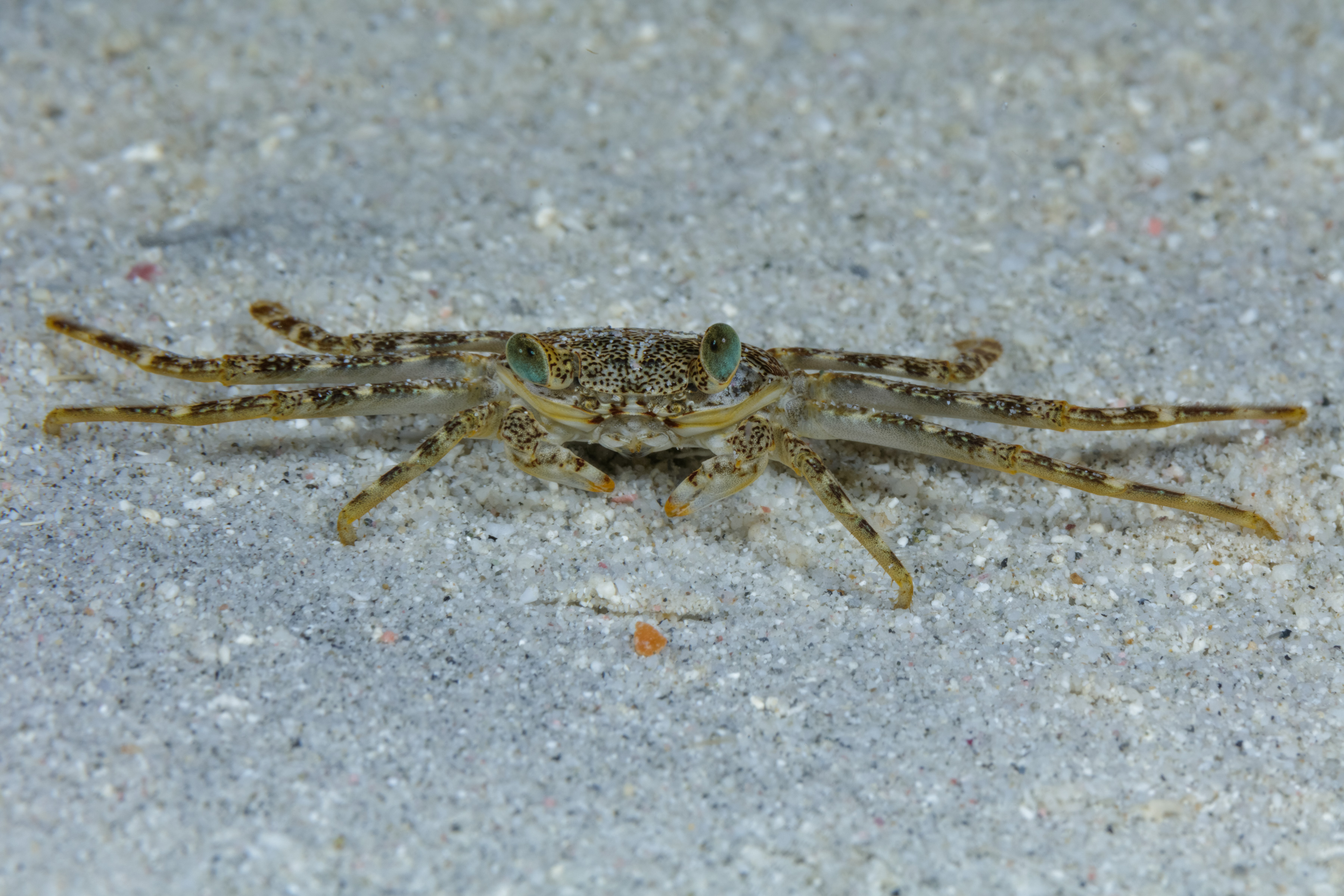 This Crab has a flat carapace with a wide variety of colors, often marked with dark spots and small bumps. Its legs and claws have light bands, dark stripes, and spots.