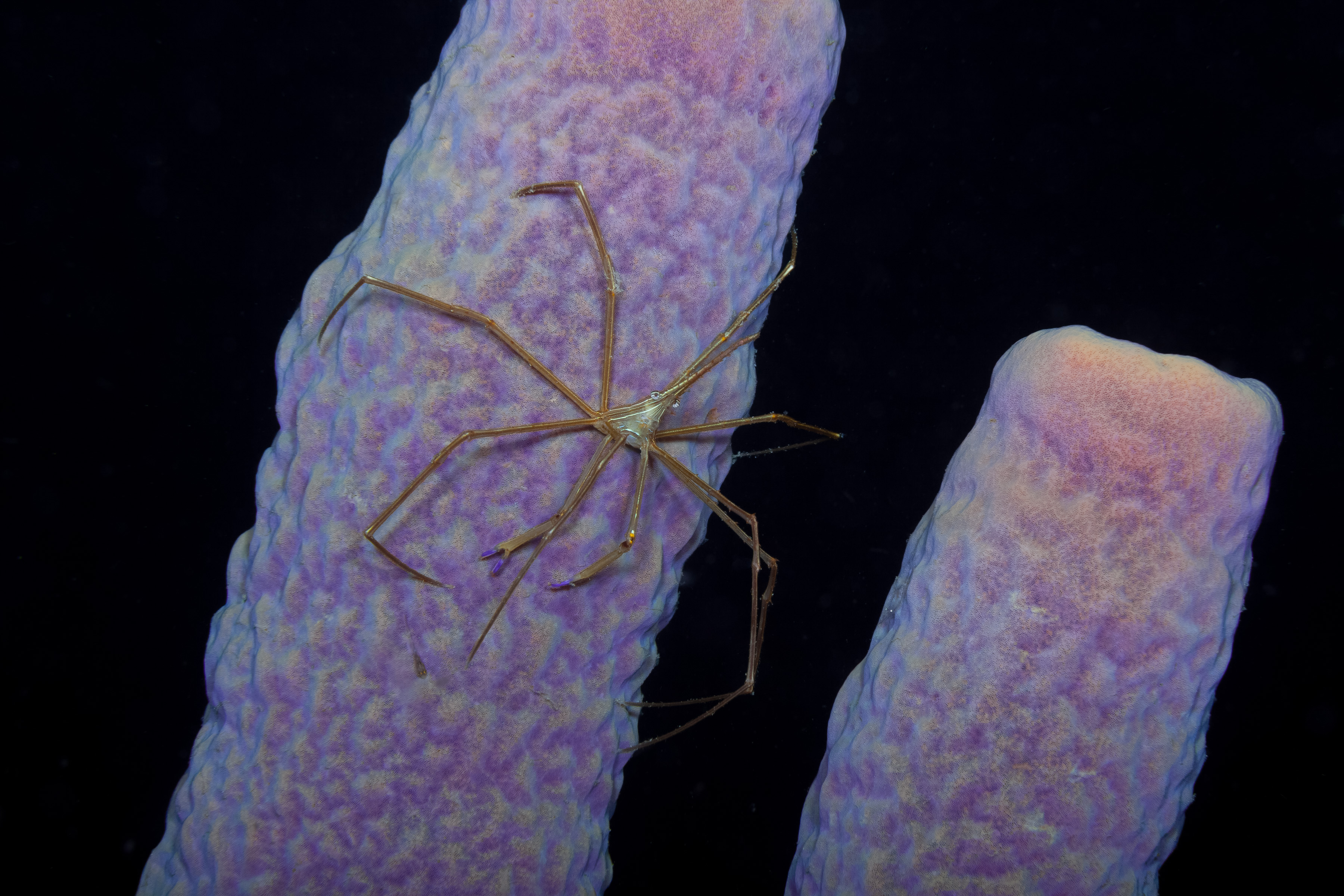 This Crab has a triangular body with stripes in white, brown, and black. It has a long, arrow-shaped snout. Its spider-like legs are marked with yellow-gold stripes, and its claws end in purple tips.