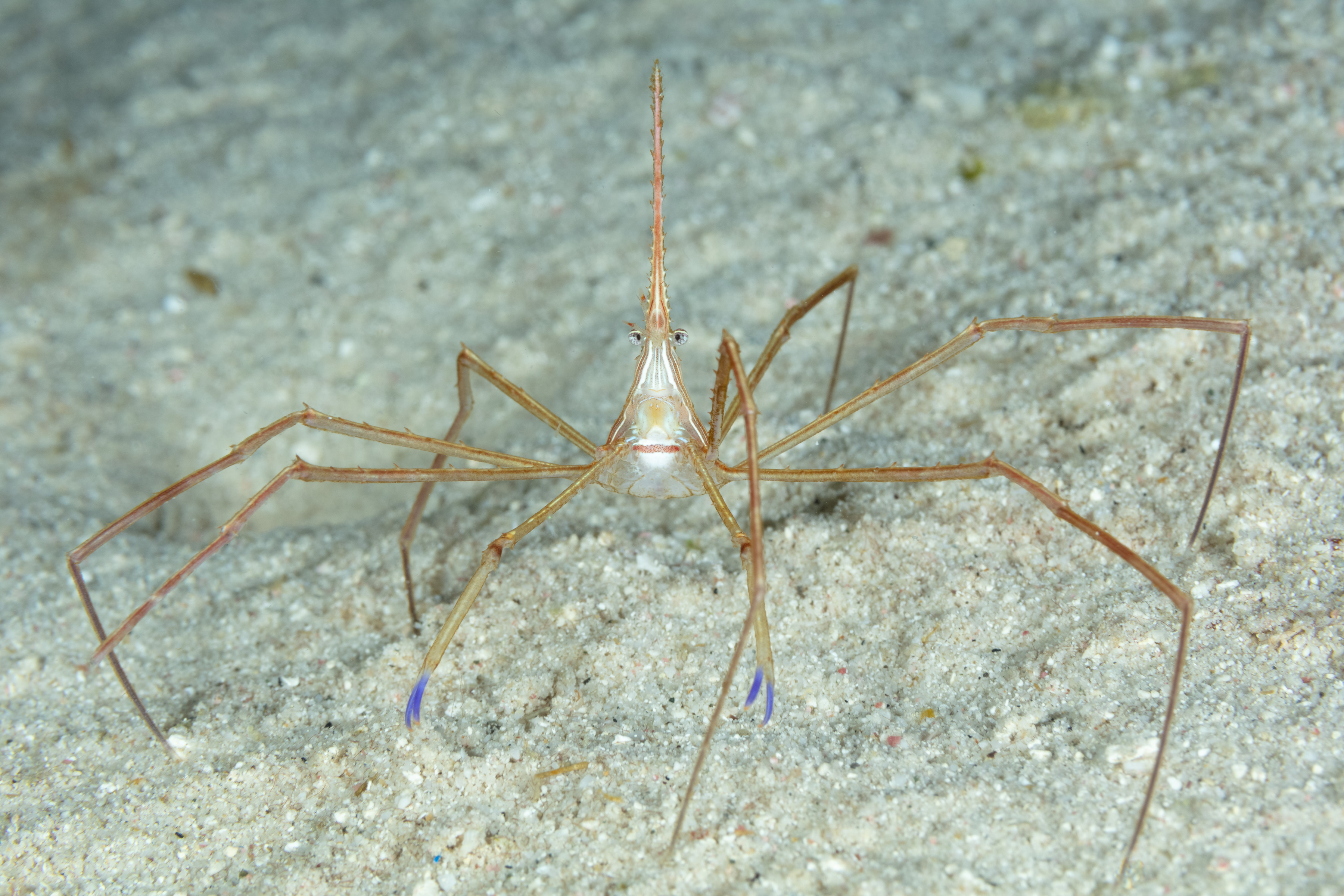 This Crab has a triangular body with stripes in white, brown, and black. It has a long, arrow-shaped snout. Its spider-like legs are marked with yellow-gold stripes, and its claws end in purple tips.