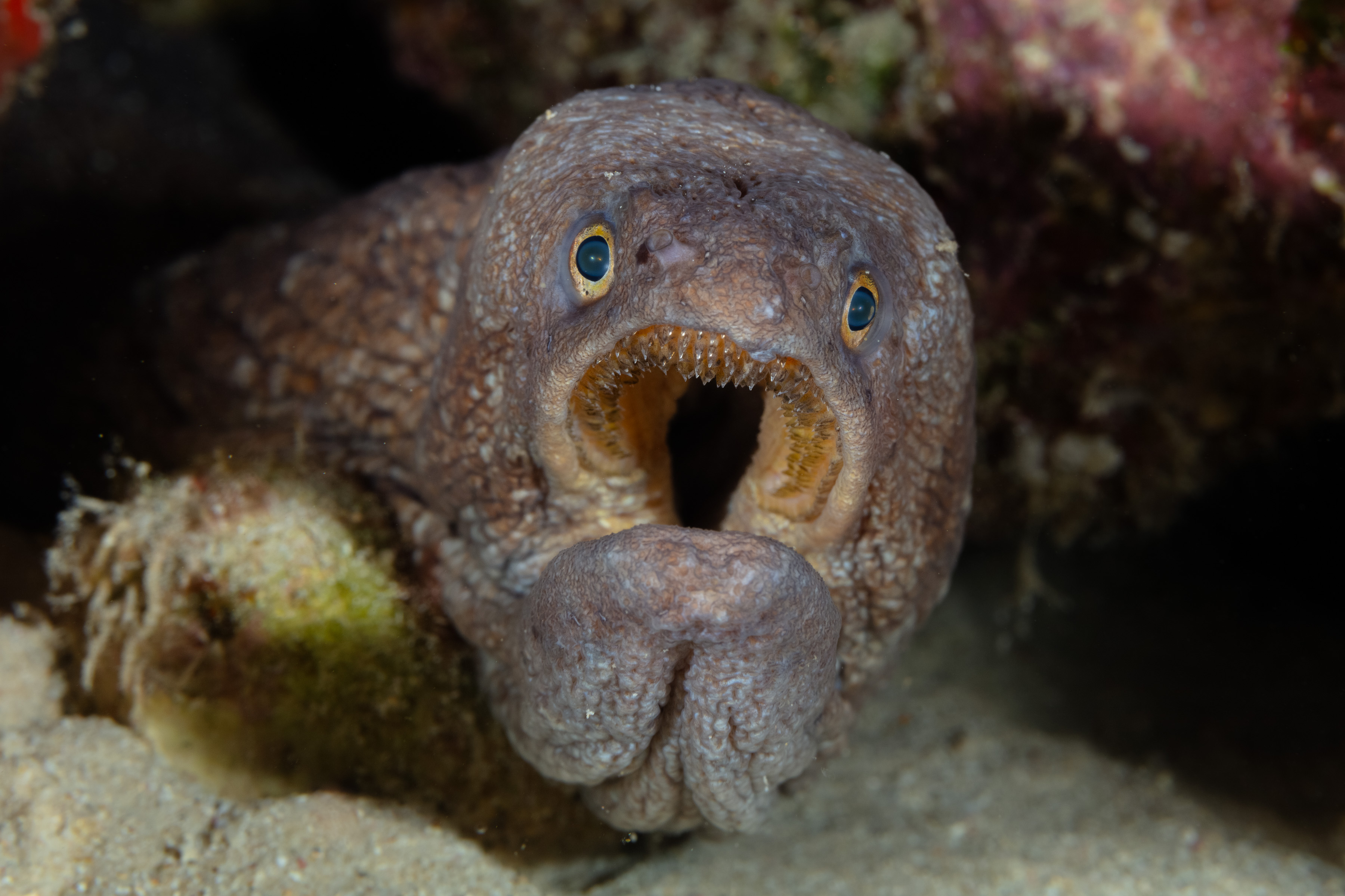 The Broadbanded Moray spends the day hiding in cracks with just its head sticking out. It often opens and closes its mouth to breathe. If threatened, it puffs up the loose skin around its head to look bigger. It usually ignores divers but will slowly move away if they get too close.