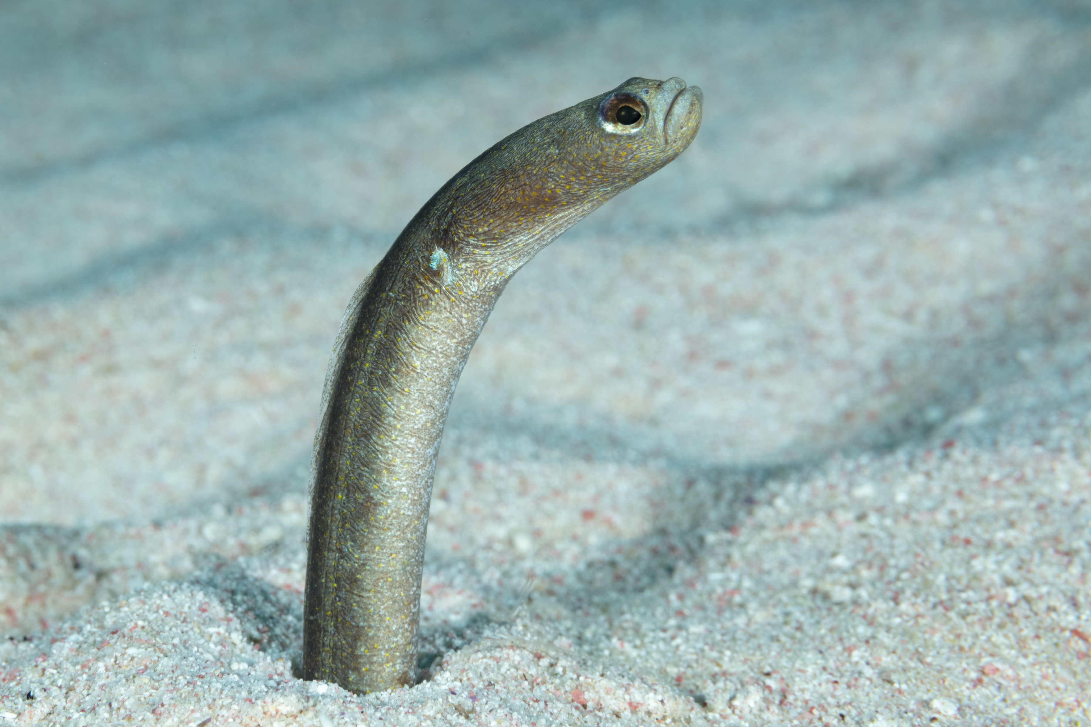 The Brown Garden Eel lives in colonies on sandy seabeds. They extend their bodies from burrows and move in gentle, wave-like motions to catch plankton drifting in the water. They are extremely shy and retreat into their burrows if divers approach too closely.