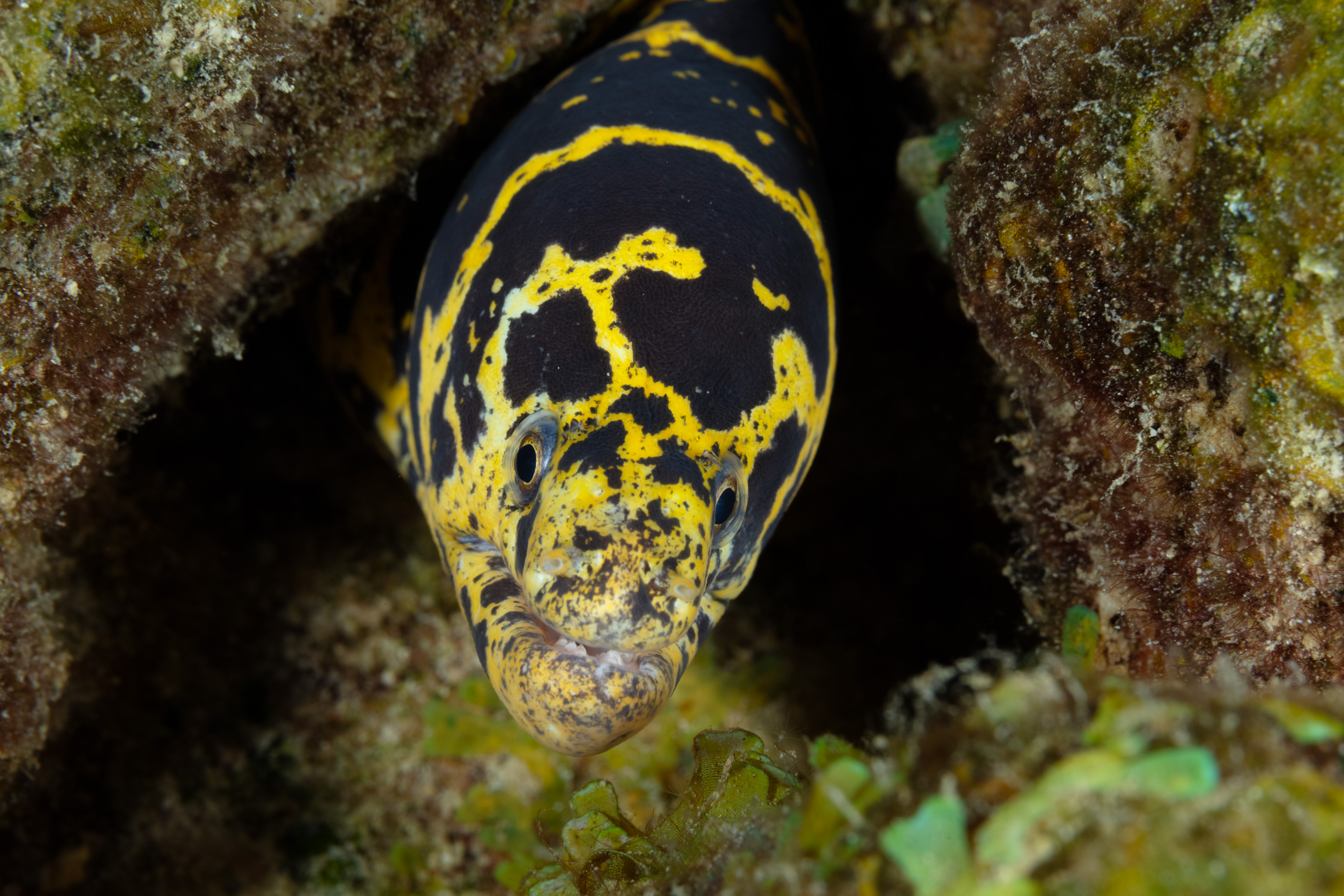 The Chain Moray is often seen in shallow waters, along rocky shores, and in tidal zones.