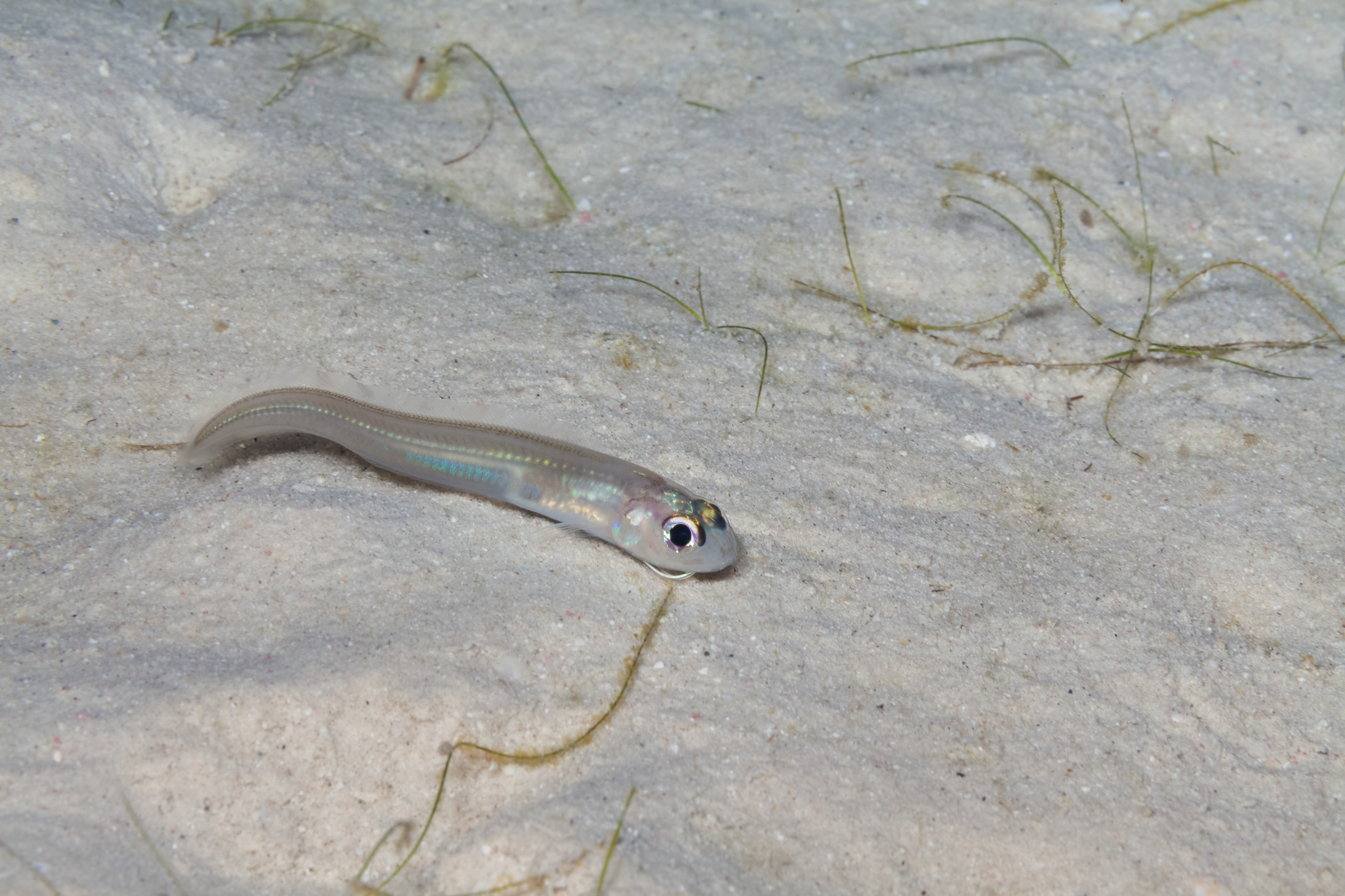 Cusk eels include over 240 species adapted to different marine environments. In the shallows they burrow tail-first into sandy bottoms or hide near turtle grass.