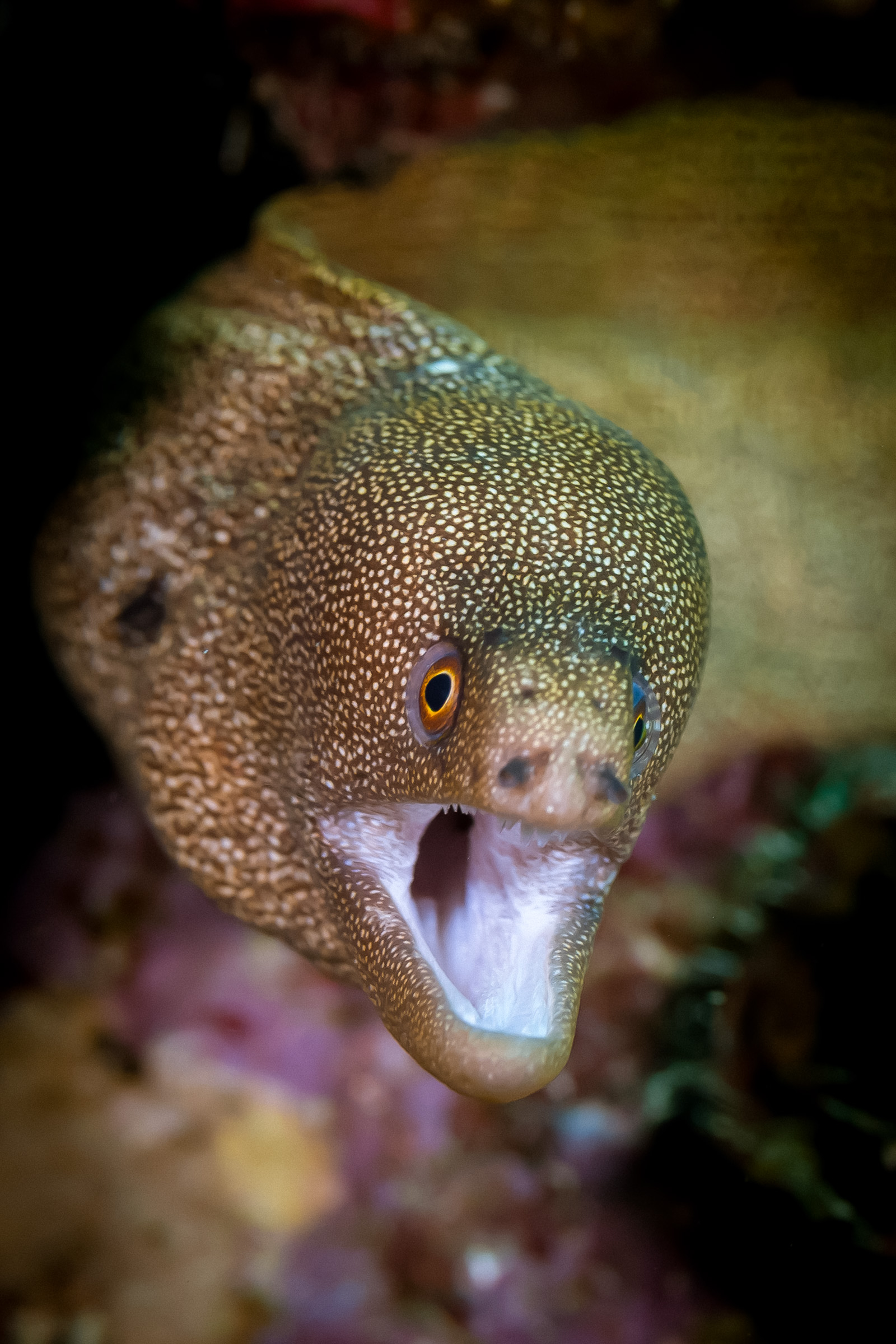 This Moray has a brown body covered with numerous small yellow spots, which can vary in size. The tip of the tail is often yellow (gold), and there is a yellow ring around the pupil of its eye.
