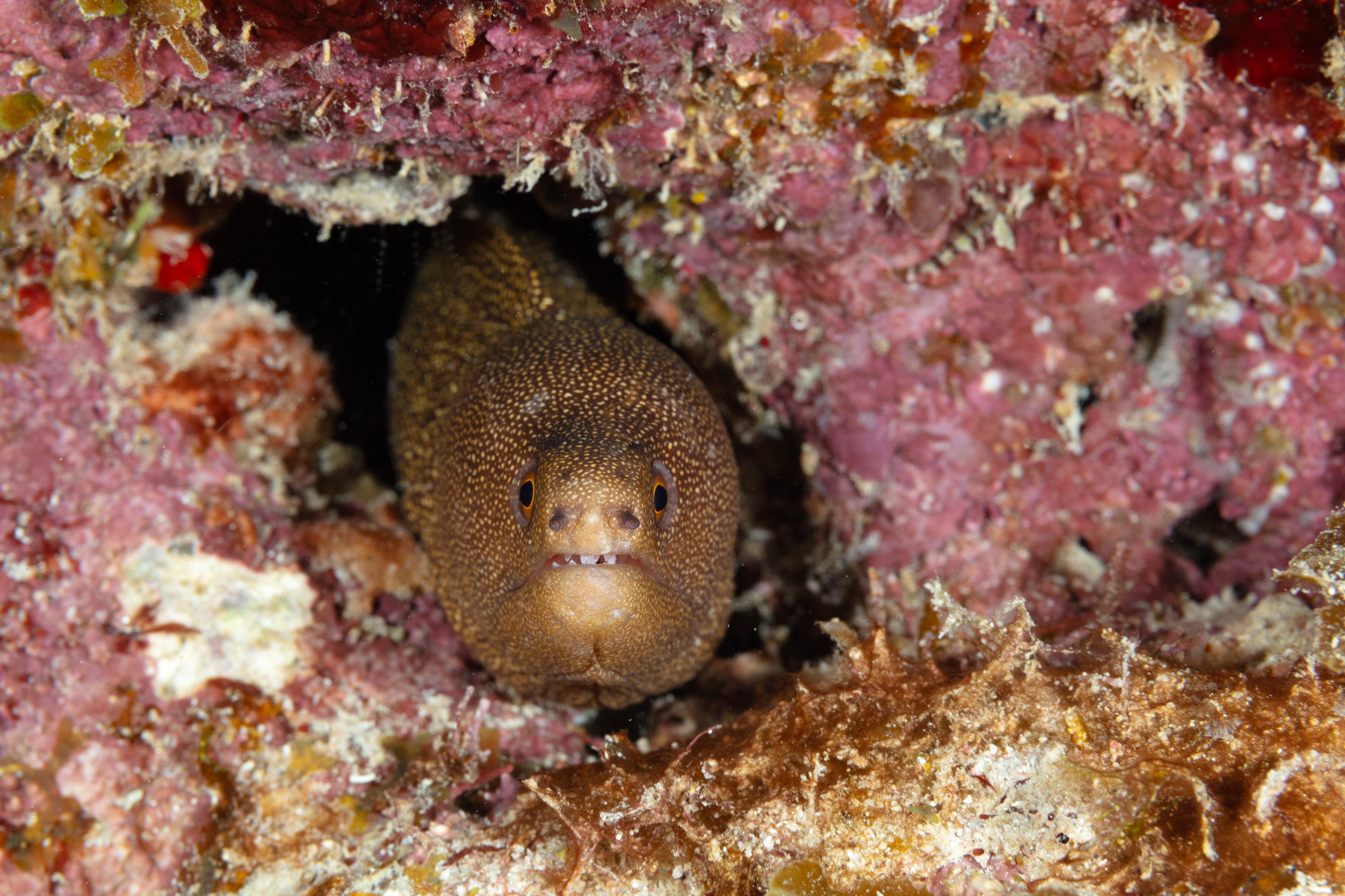 This Moray has a brown body covered with numerous small yellow spots, which can vary in size. The tip of the tail is often yellow (gold), and there is a yellow ring around the pupil of its eye.