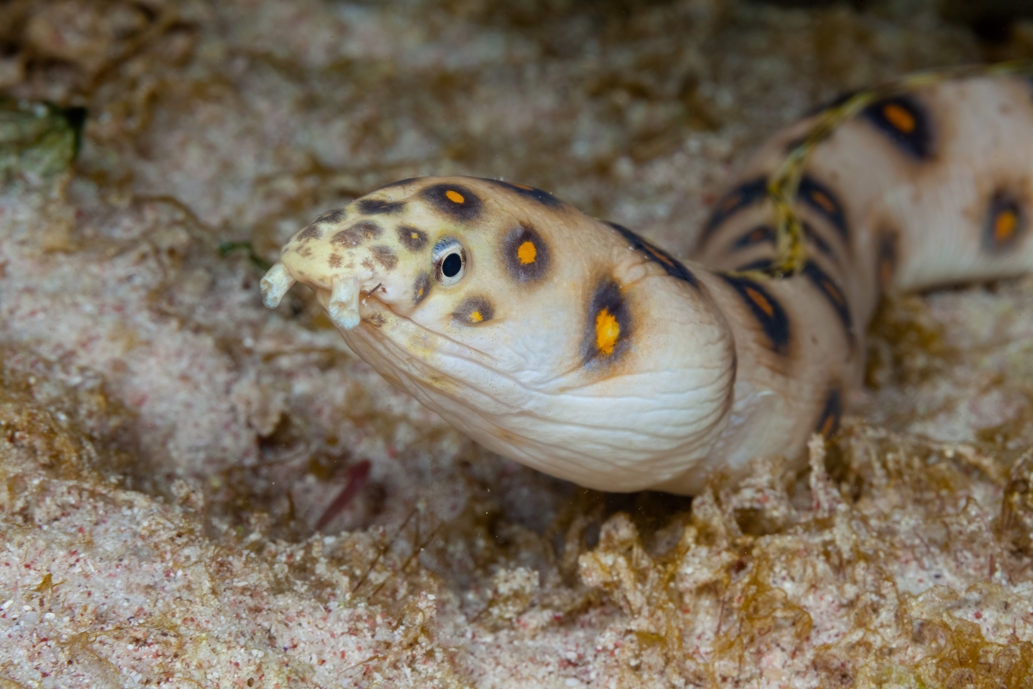 The Goldspotted Eel is typically found hiding in sand or shallow crevices during the day.