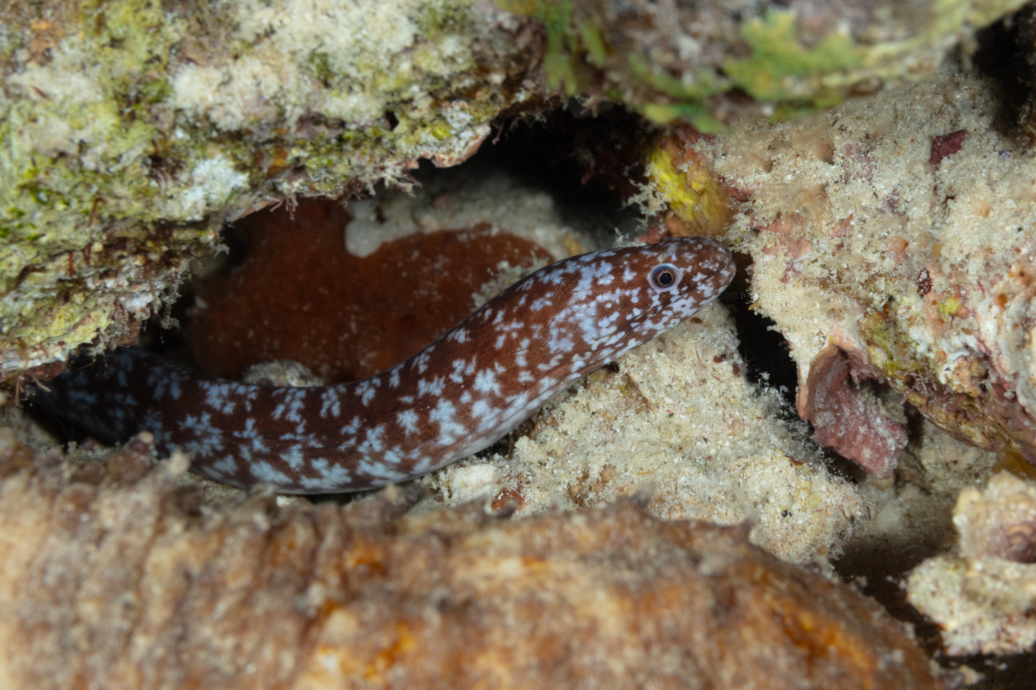 This Moray has a brown body with pale white blotches, which can be bold or faint, giving it a marbled appearance. Numerous pale spots are visible on the head and lower jaw.