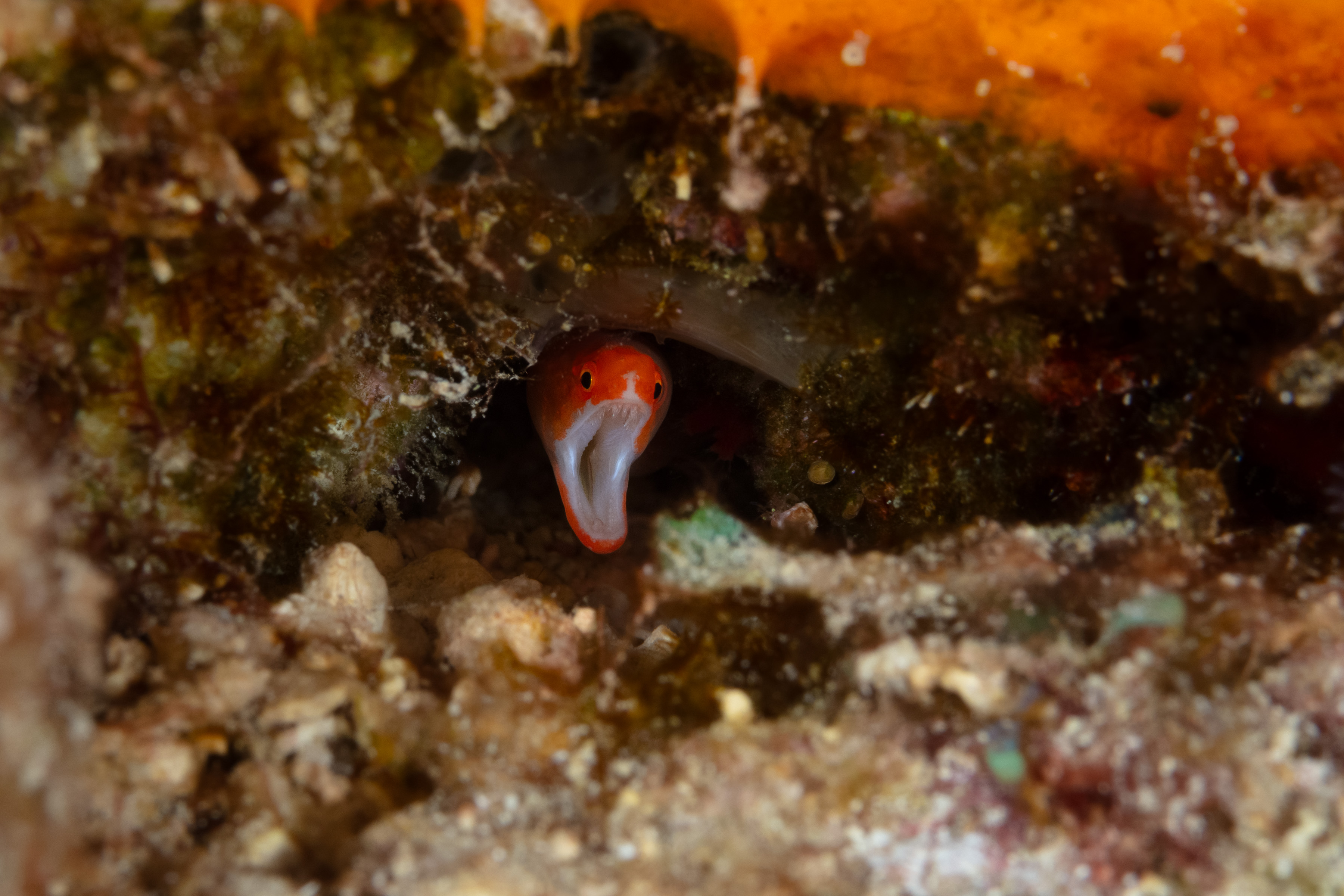 This small Moray has a slender, reddish-orange body about as wide as a soda straw. Its dorsal fin starts far back on the body.