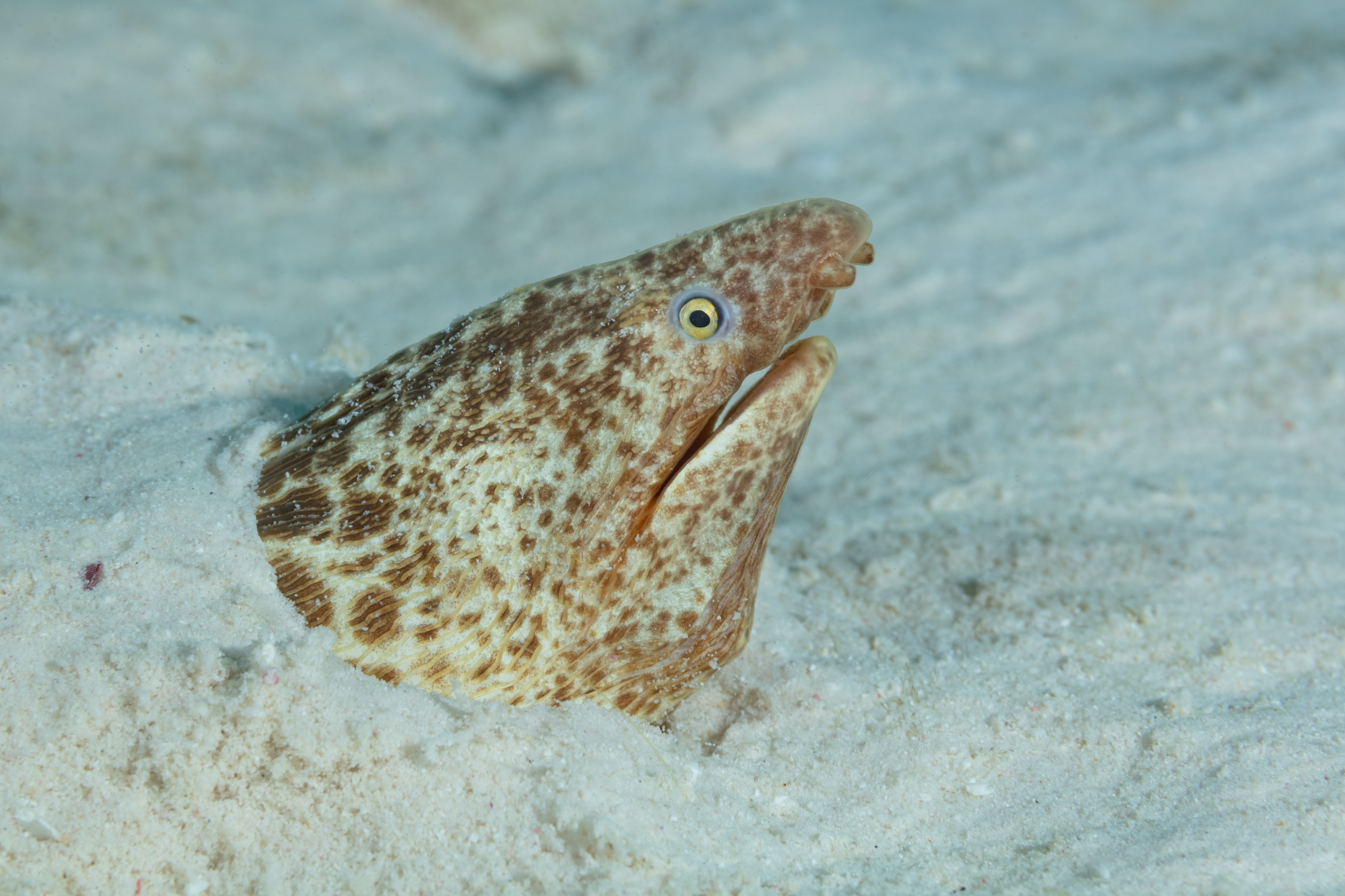 This Snake Eel lives buried in sandy areas, often mixed with algae or seagrass. It usually hides with only its head and part of the body exposed.