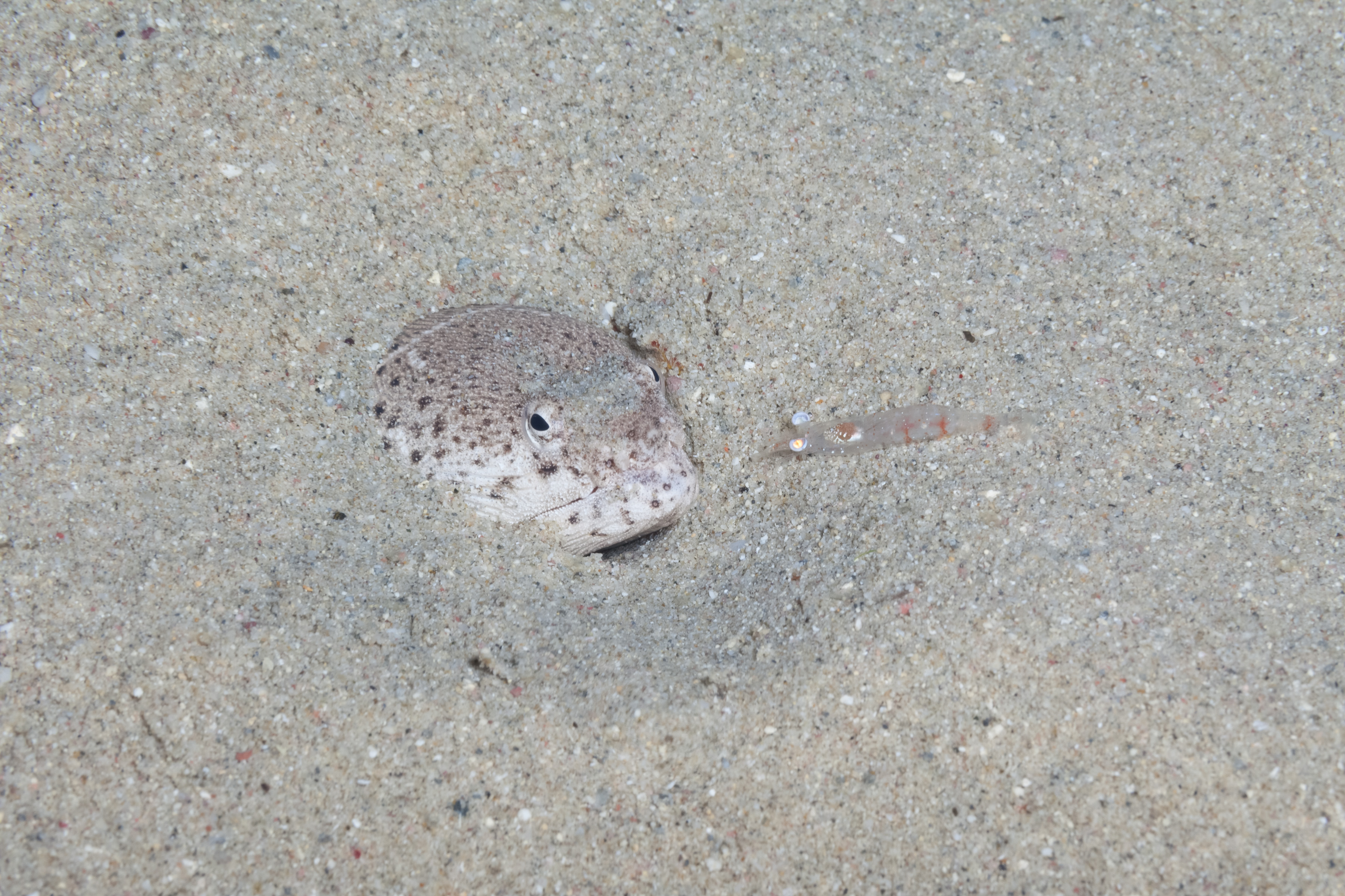 The Spotted Spoon-Nose Eel hides in sandy areas during the day, leaving only the head visible. It sometimes moves beneath the sand and emerges elsewhere. The eel allows divers to come close but will withdraw into the sand if approached too closely.