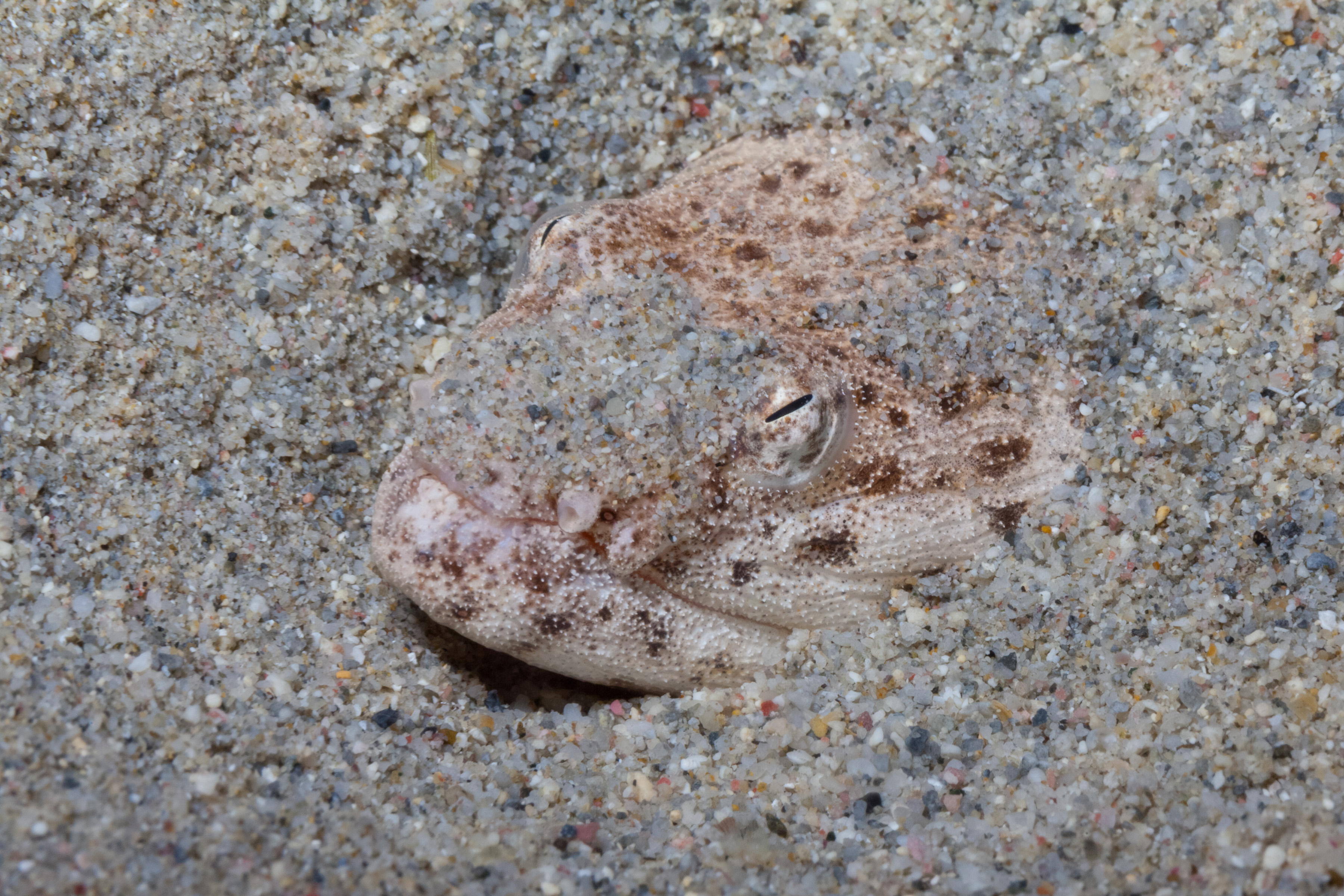 The Spotted Spoon-Nose Eel hides in sandy areas during the day, leaving only the head visible. It sometimes moves beneath the sand and emerges elsewhere. The eel allows divers to come close but will withdraw into the sand if approached too closely.
