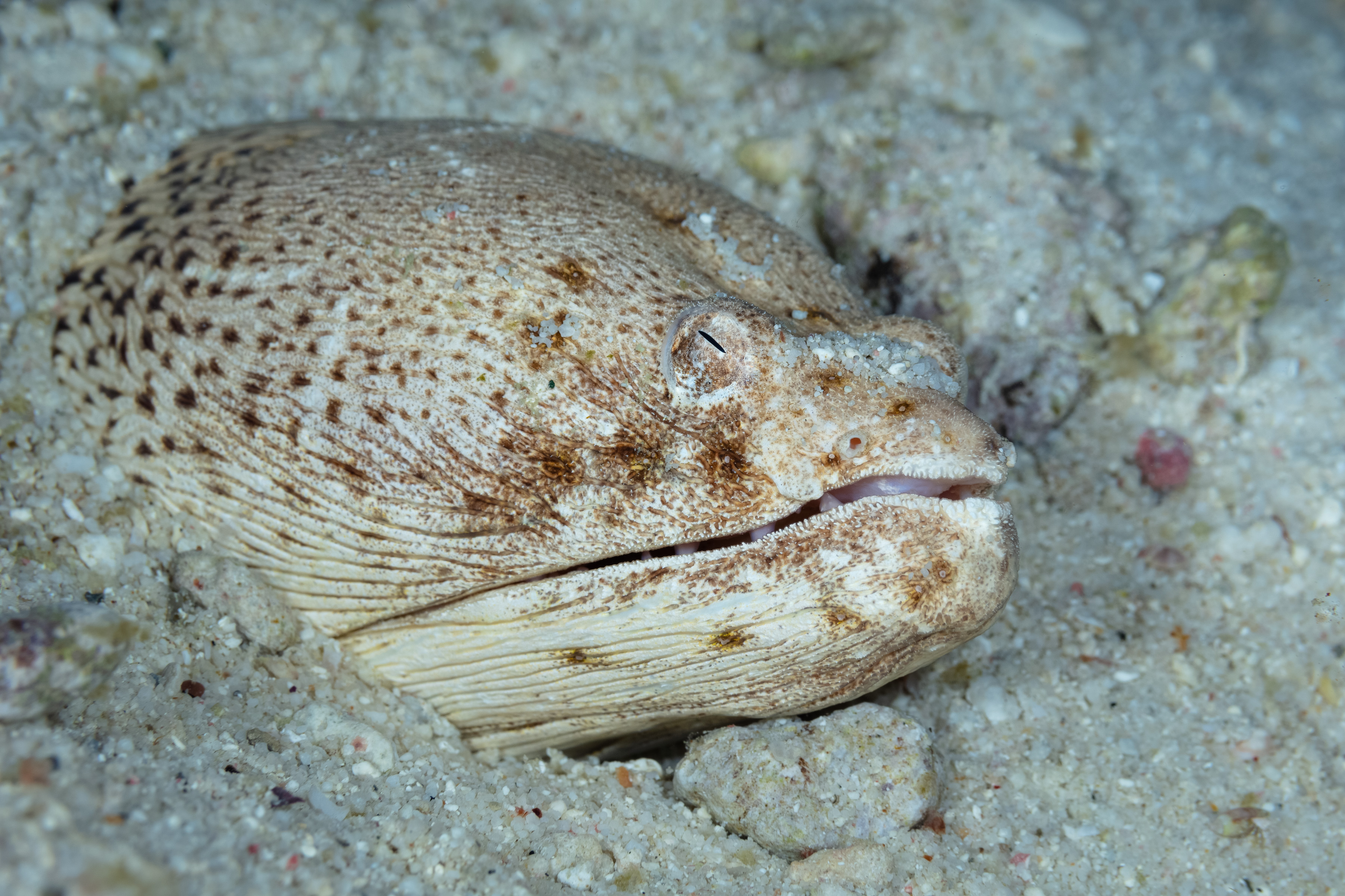 The Spotted Spoon-Nose Eel hides in sandy areas during the day, leaving only the head visible. It sometimes moves beneath the sand and emerges elsewhere. The eel allows divers to come close but will withdraw into the sand if approached too closely.