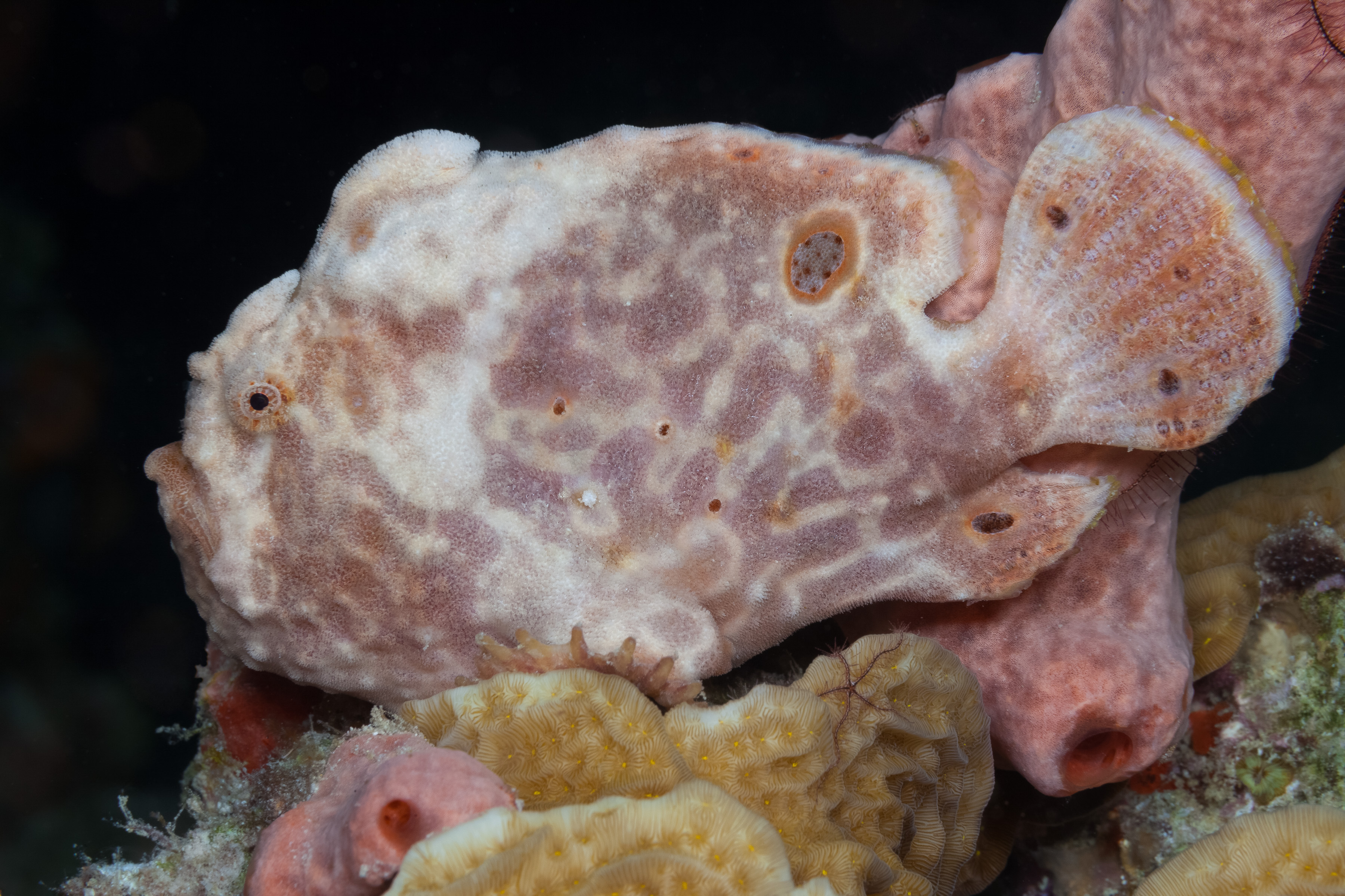 The Longlure Frogfish is often found alone or in pairs on the reef, appearing largely unconcerned with its surroundings. It uses its exceptional camouflage to blend in while waiting motionless for prey. The frogfish attracts prey with its unique lure, flicking it in front of its mouth to mimic a small shrimp. If the lure is damaged, it can regrow, though the new one may be smaller. When prey gets close, its mouth opens so rapidly that it creates a vacuum, sucking the animal in, and it can even swallow prey nearly its own size.