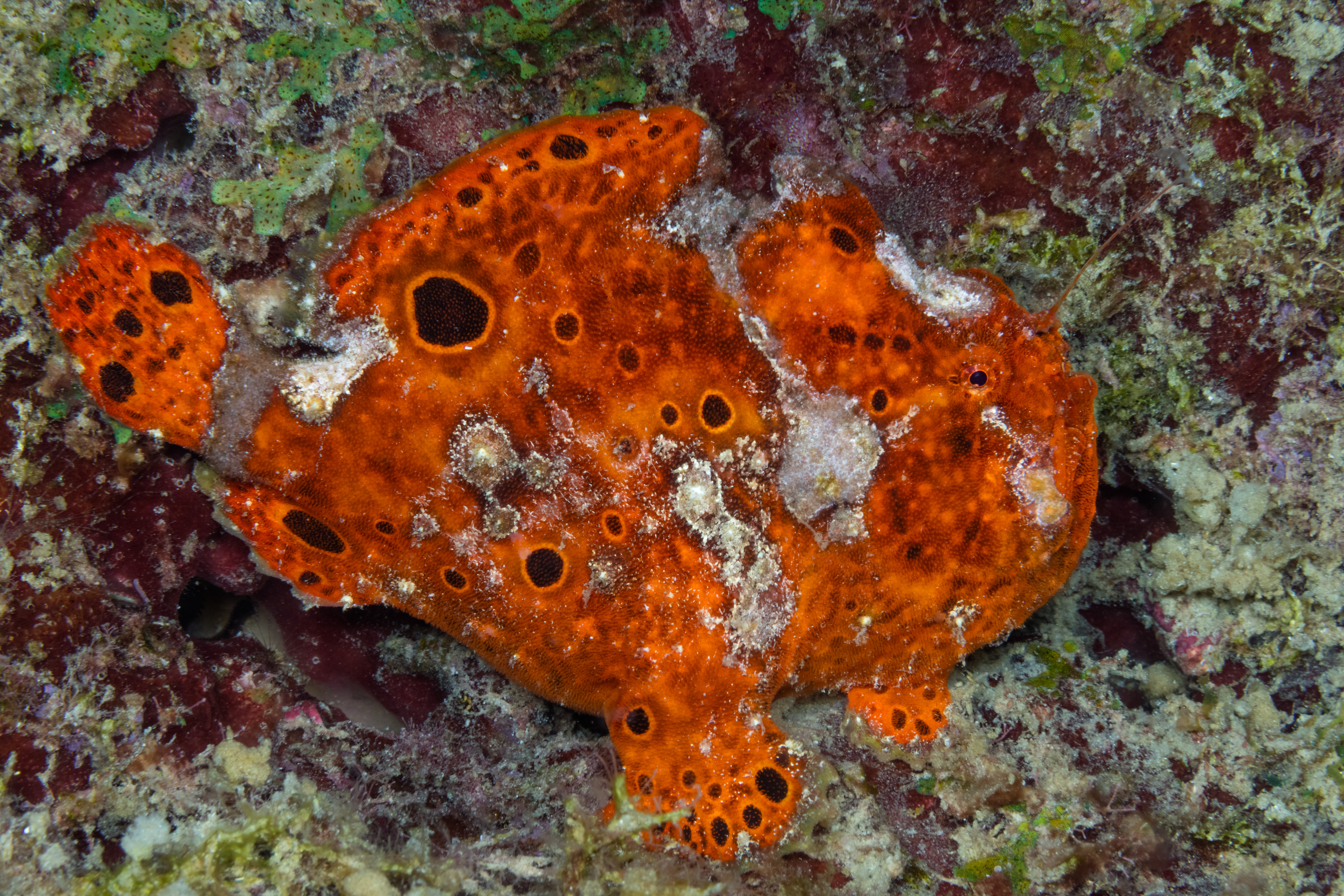 The Longlure Frogfish is often found alone or in pairs on the reef, appearing largely unconcerned with its surroundings. It uses its exceptional camouflage to blend in while waiting motionless for prey. The frogfish attracts prey with its unique lure, flicking it in front of its mouth to mimic a small shrimp. If the lure is damaged, it can regrow, though the new one may be smaller. When prey gets close, its mouth opens so rapidly that it creates a vacuum, sucking the animal in, and it can even swallow prey nearly its own size.