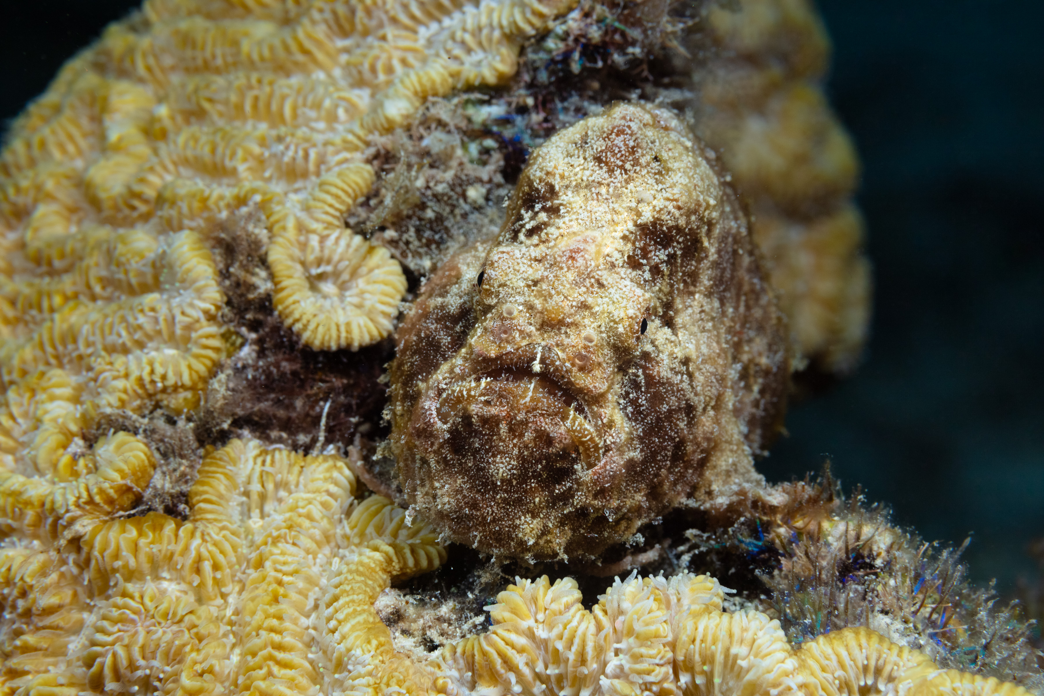 The Longlure Frogfish is often found alone or in pairs on the reef, appearing largely unconcerned with its surroundings. It uses its exceptional camouflage to blend in while waiting motionless for prey. The frogfish attracts prey with its unique lure, flicking it in front of its mouth to mimic a small shrimp. If the lure is damaged, it can regrow, though the new one may be smaller. When prey gets close, its mouth opens so rapidly that it creates a vacuum, sucking the animal in, and it can even swallow prey nearly its own size.