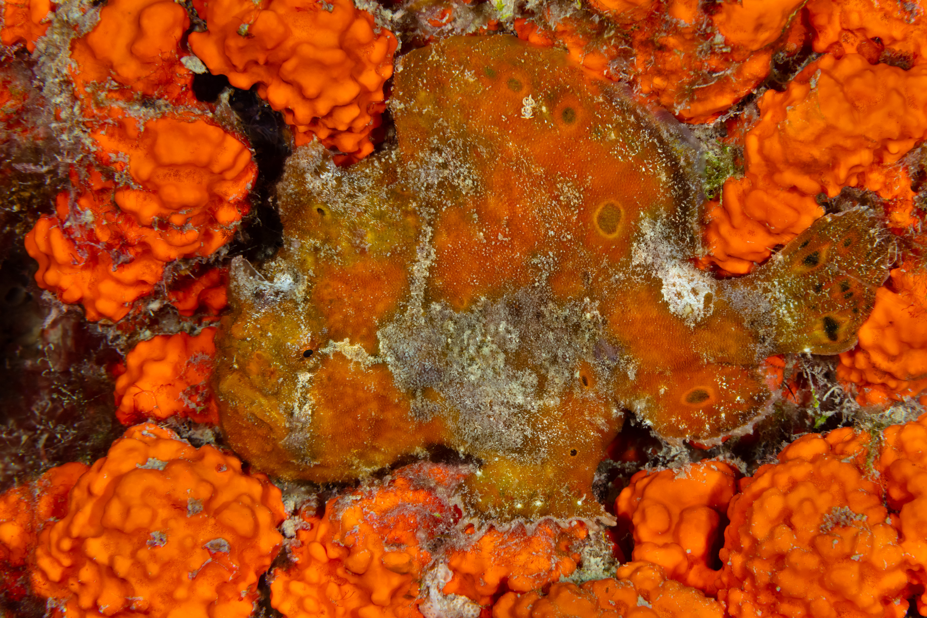 The Longlure Frogfish is often found alone or in pairs on the reef, appearing largely unconcerned with its surroundings. It uses its exceptional camouflage to blend in while waiting motionless for prey. The frogfish attracts prey with its unique lure, flicking it in front of its mouth to mimic a small shrimp. If the lure is damaged, it can regrow, though the new one may be smaller. When prey gets close, its mouth opens so rapidly that it creates a vacuum, sucking the animal in, and it can even swallow prey nearly its own size.