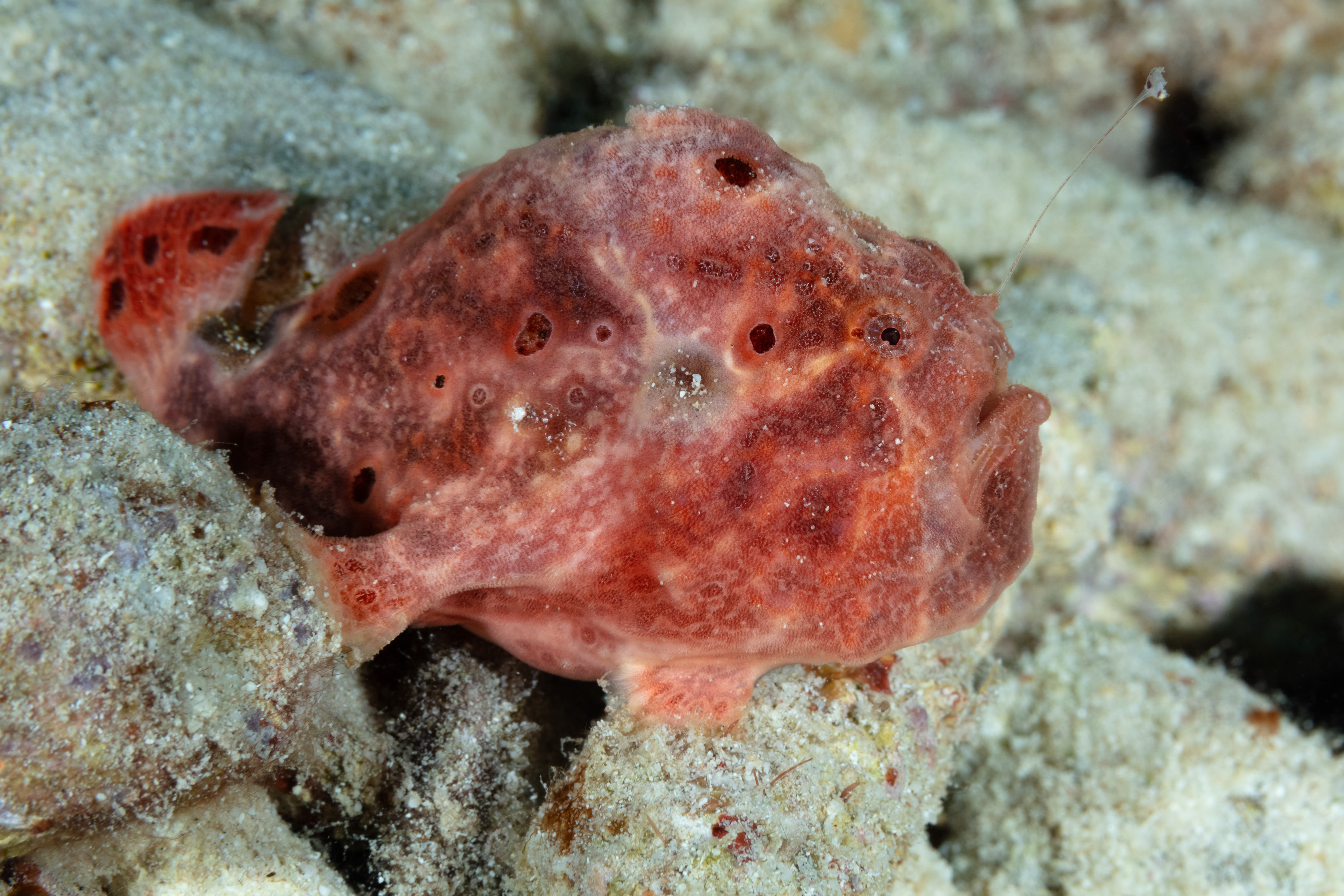 The Longlure Frogfish is often found alone or in pairs on the reef, appearing largely unconcerned with its surroundings. It uses its exceptional camouflage to blend in while waiting motionless for prey. The frogfish attracts prey with its unique lure, flicking it in front of its mouth to mimic a small shrimp. If the lure is damaged, it can regrow, though the new one may be smaller. When prey gets close, its mouth opens so rapidly that it creates a vacuum, sucking the animal in, and it can even swallow prey nearly its own size.