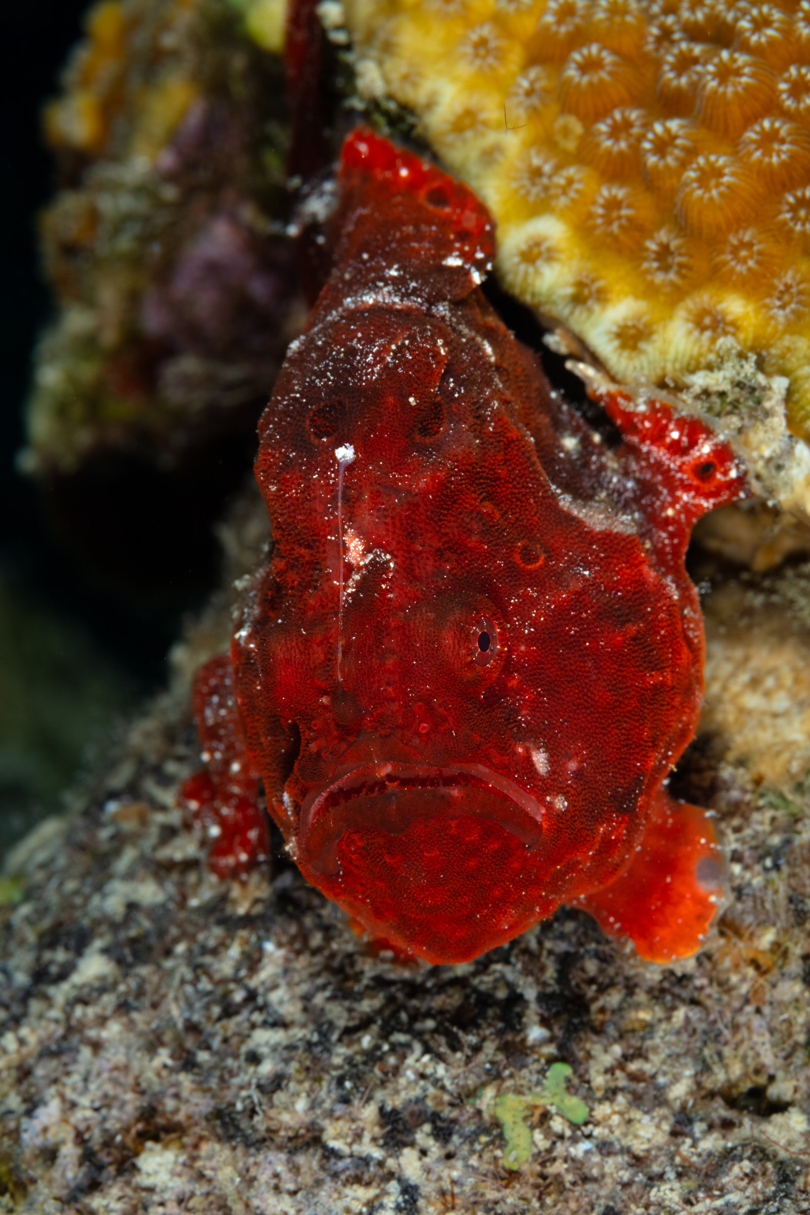 The Longlure Frogfish is often found alone or in pairs on the reef, appearing largely unconcerned with its surroundings. It uses its exceptional camouflage to blend in while waiting motionless for prey. The frogfish attracts prey with its unique lure, flicking it in front of its mouth to mimic a small shrimp. If the lure is damaged, it can regrow, though the new one may be smaller. When prey gets close, its mouth opens so rapidly that it creates a vacuum, sucking the animal in, and it can even swallow prey nearly its own size.