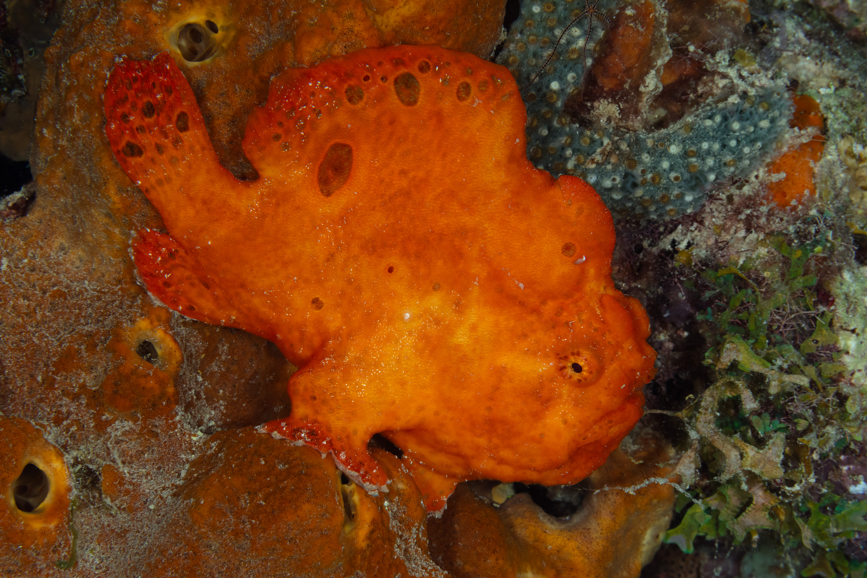 The Longlure Frogfish is often found alone or in pairs on the reef, appearing largely unconcerned with its surroundings. It uses its exceptional camouflage to blend in while waiting motionless for prey. The frogfish attracts prey with its unique lure, flicking it in front of its mouth to mimic a small shrimp. If the lure is damaged, it can regrow, though the new one may be smaller. When prey gets close, its mouth opens so rapidly that it creates a vacuum, sucking the animal in, and it can even swallow prey nearly its own size.