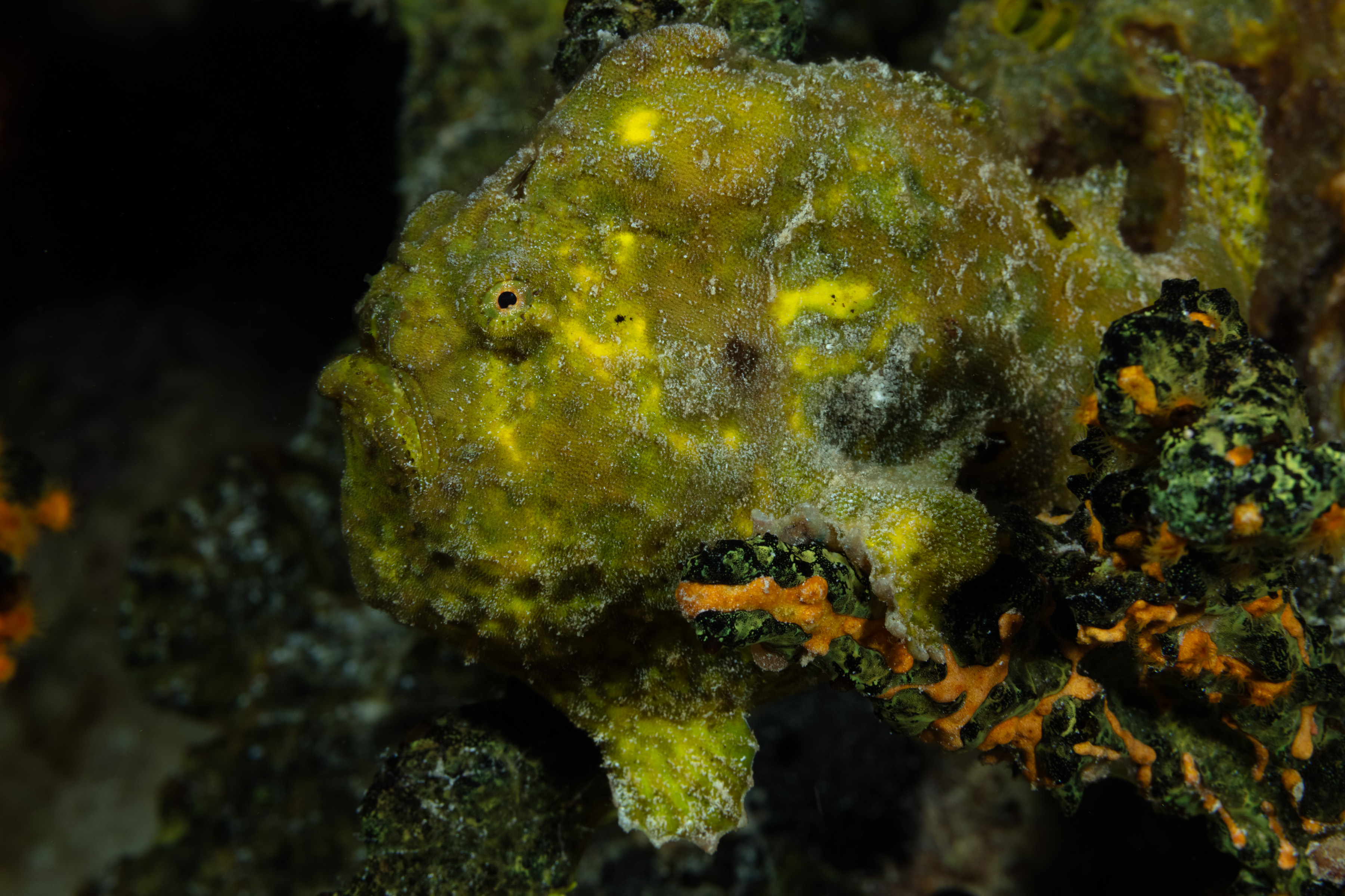 The Longlure Frogfish is often found alone or in pairs on the reef, appearing largely unconcerned with its surroundings. It uses its exceptional camouflage to blend in while waiting motionless for prey. The frogfish attracts prey with its unique lure, flicking it in front of its mouth to mimic a small shrimp. If the lure is damaged, it can regrow, though the new one may be smaller. When prey gets close, its mouth opens so rapidly that it creates a vacuum, sucking the animal in, and it can even swallow prey nearly its own size.