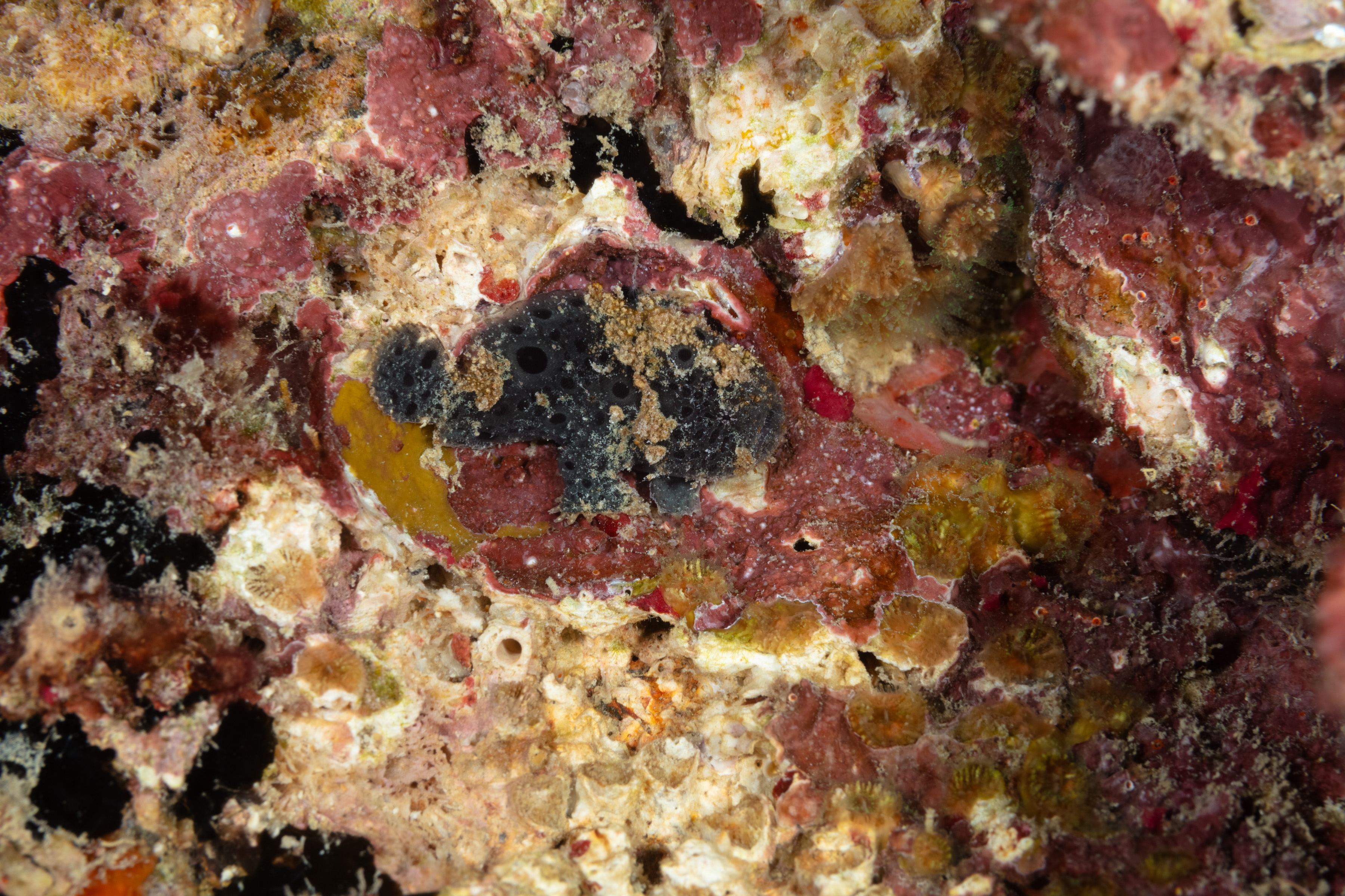 The Longlure Frogfish is often found alone or in pairs on the reef, appearing largely unconcerned with its surroundings. It uses its exceptional camouflage to blend in while waiting motionless for prey. The frogfish attracts prey with its unique lure, flicking it in front of its mouth to mimic a small shrimp. If the lure is damaged, it can regrow, though the new one may be smaller. When prey gets close, its mouth opens so rapidly that it creates a vacuum, sucking the animal in, and it can even swallow prey nearly its own size.