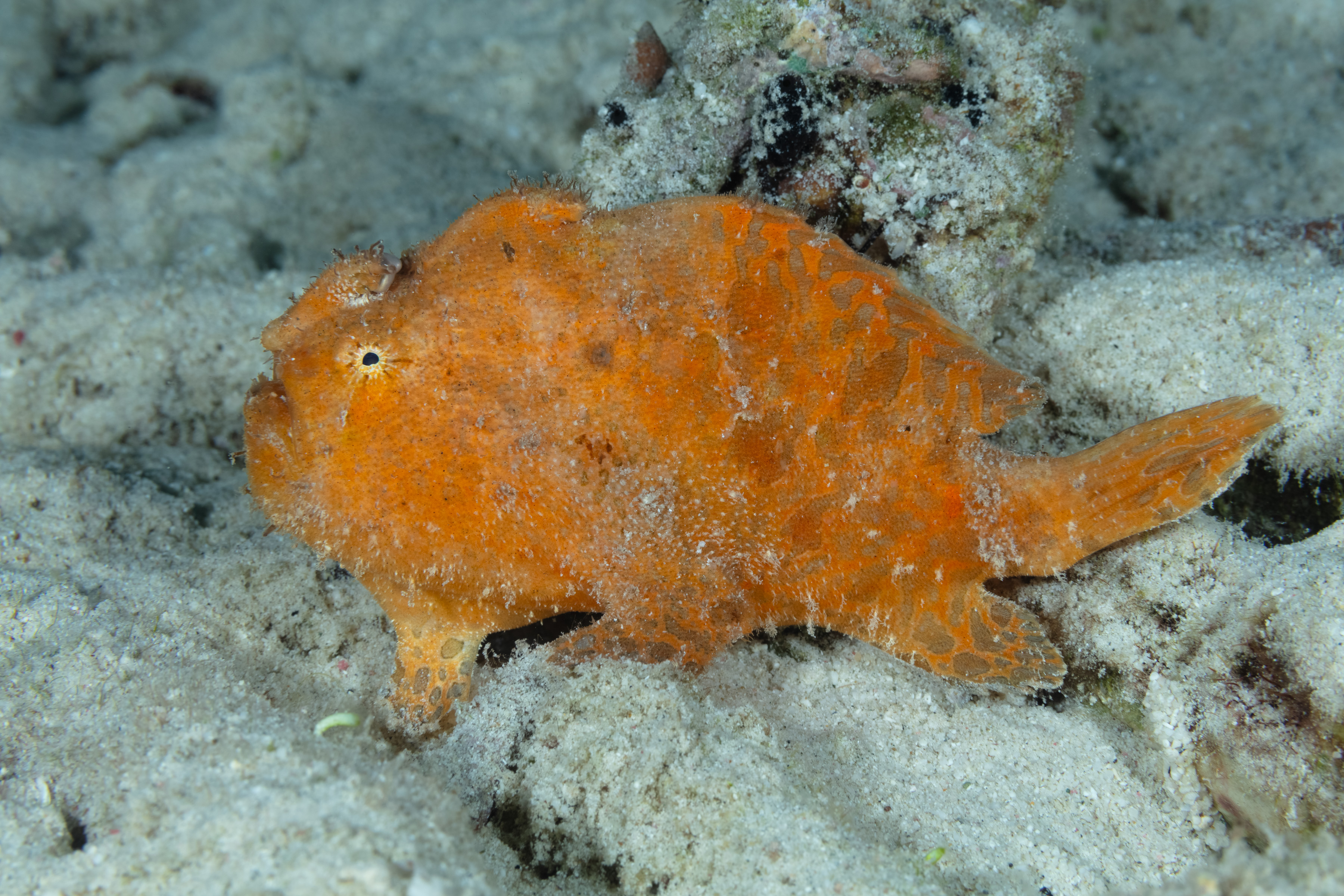 The Striated Frogfish (Antennarius scaber) is also called the Splitlure Frogfish, not the Hairy Frogfish. The species Antennarius striatus, found in the Indo-Pacific, is commonly known as the Hairy Frogfish and is sometimes also called the Striated Frogfish. The Striated Frogfish often inhabits rubble areas and muddy or sandy seafloors, where it blends in and stays motionless to avoid detection. It is a poor swimmer and relies on its camouflage for protection, remaining still unless disturbed. It uses its worm-like lure to attract prey, striking with one of the fastest bites in the ocean. Its mouth opens so quickly that it creates a vacuum, sucking the prey in. It can even swallow prey nearly its own size.