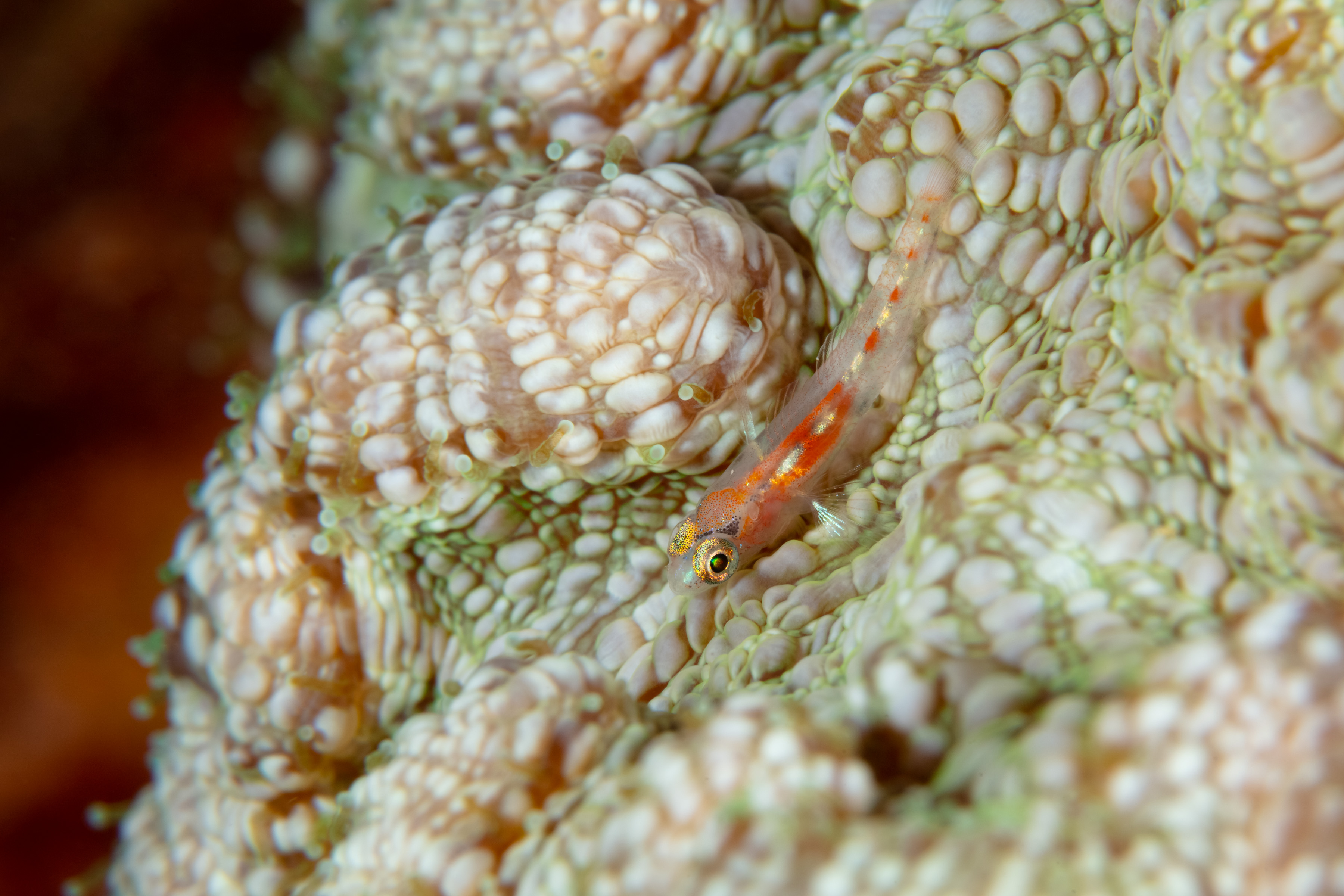 This small Goby is translucent to bright orange, with small white bars along its side.