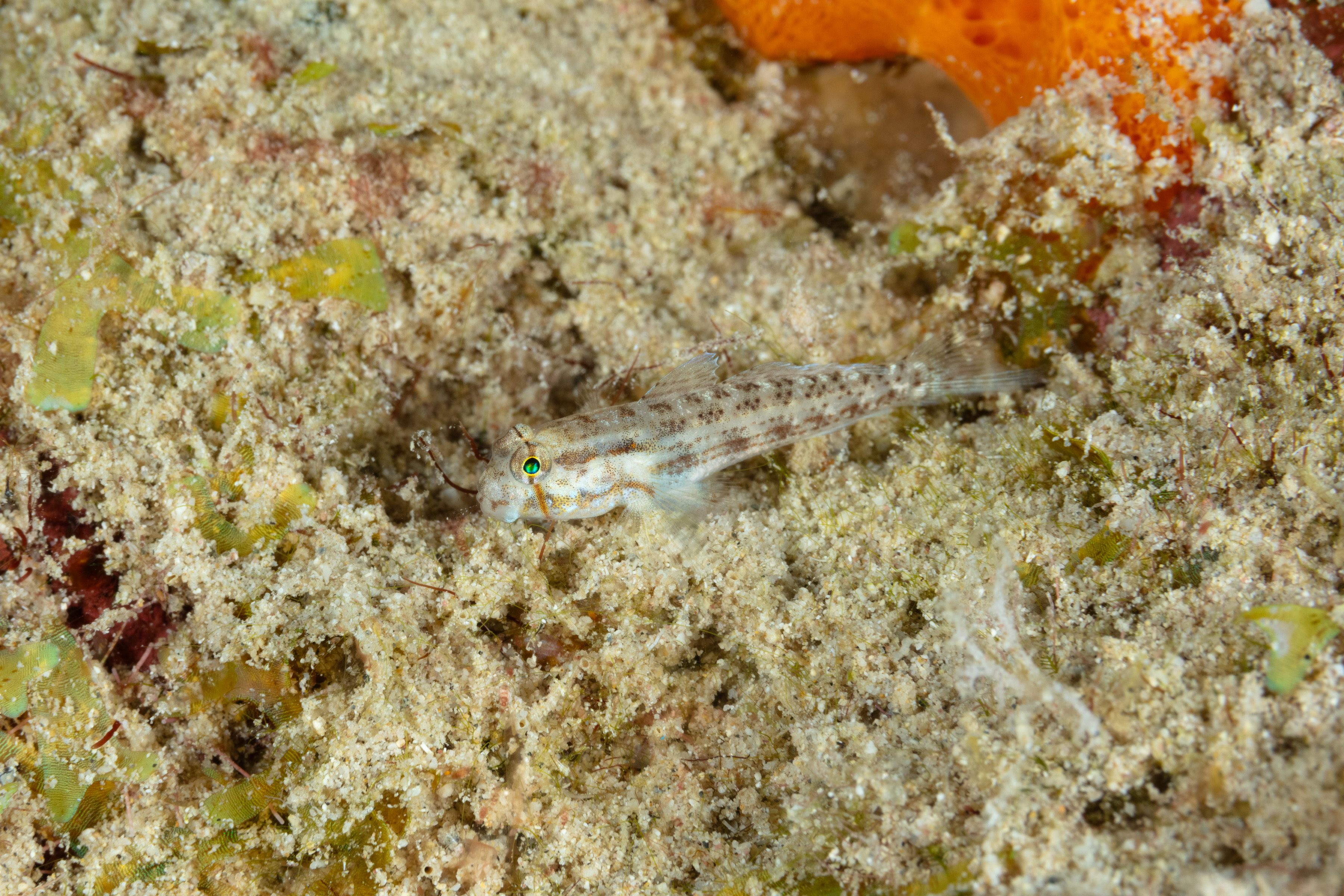 This Goby has a white to tan body, with a gold spot above the pectoral fin that is not always noticeable. A dark bar extends from the top of the head, crossing the eyes and continuing down the cheek. Dark spots and small orange-brown dots are scattered along its body.