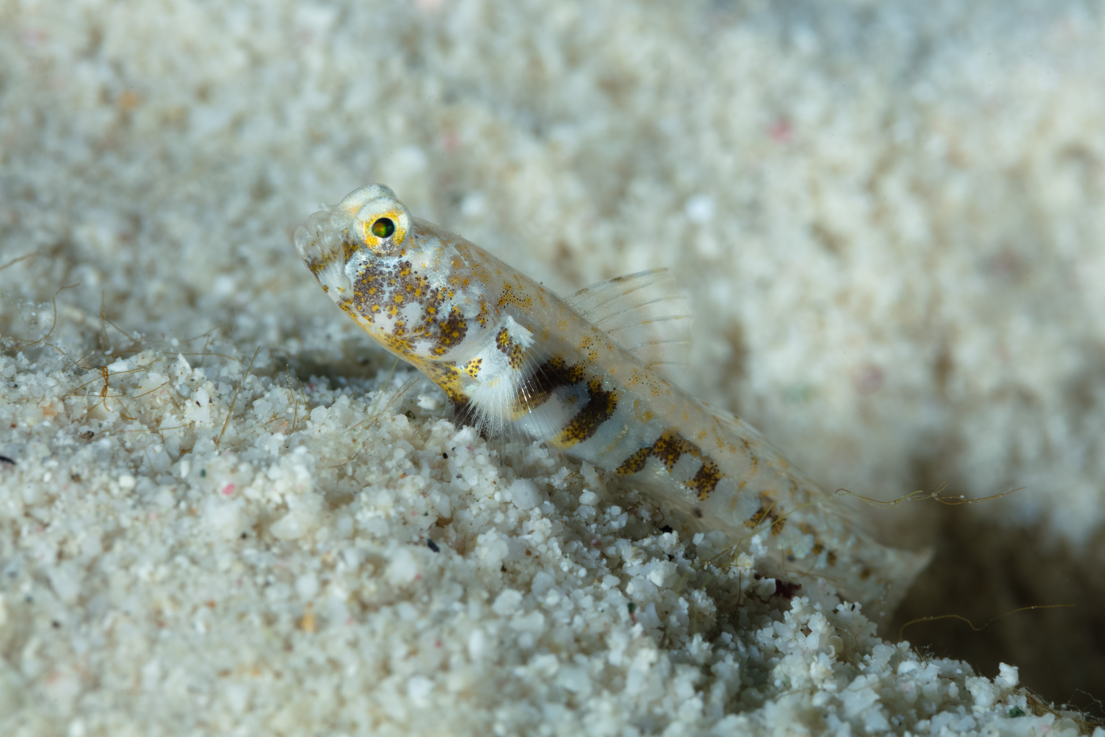 The Orangespotted Goby lives in burrows in sandy areas, often sharing them with Sand Snapping Shrimp and serving as a guard. It is shy and retreats into its burrow when approached but may reappear later.