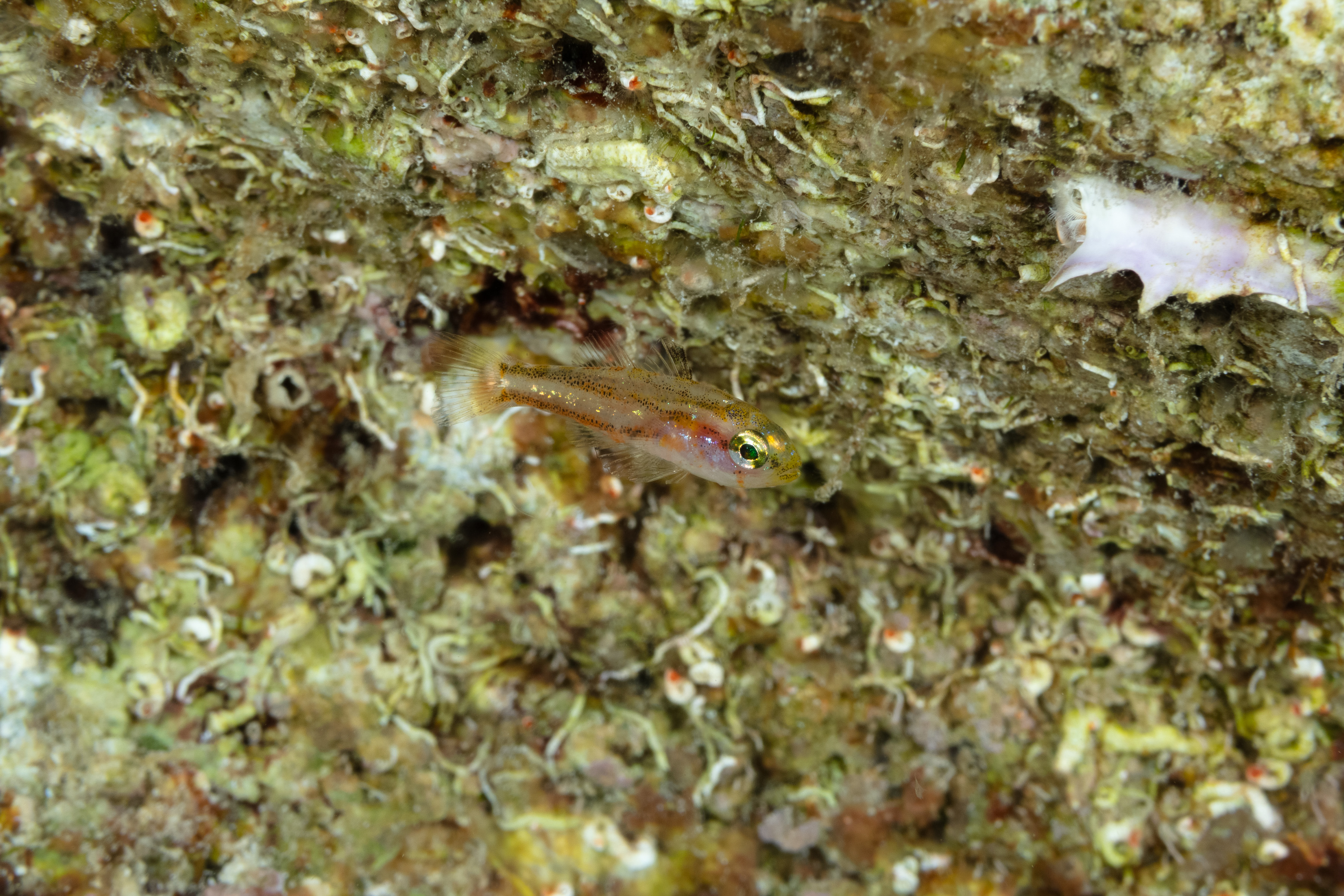 The Bantam Bass is active and cautious, and can be found in small groups mixed with other small fish, such as juvenile Creole Wrasse. It feeds on zooplankton, catching tiny drifting prey throughout the day.