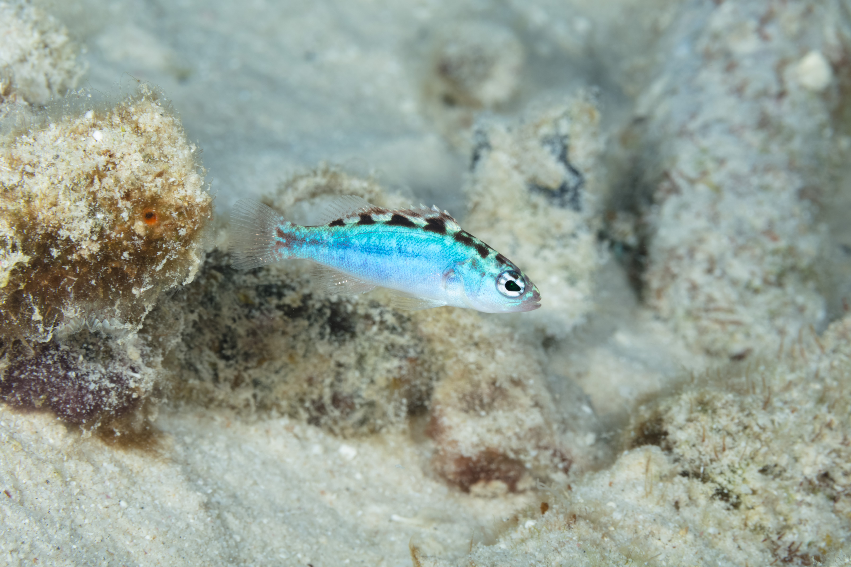 The Chalk Bass can be seen hovering over sandy patches and rocky rubble in shallow water and is somewhat cautious. It feeds during the day on tiny crustaceans and zooplankton. It has both male and female reproductive organs at the same time and can take turns acting as either male or female during spawning.