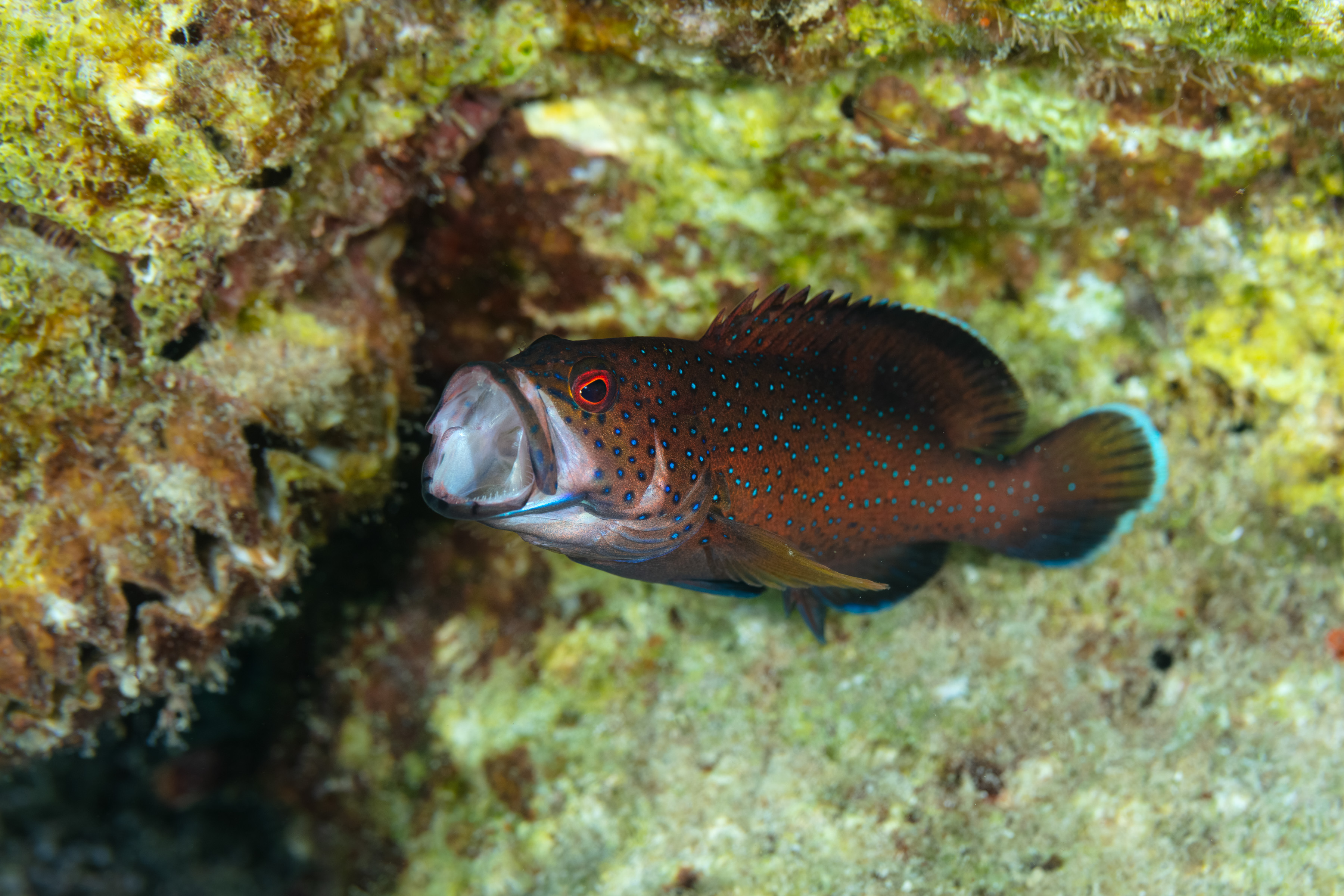 The Coney is usually seen alone, often hiding in crevices or under ledges during the day. It is a top predator that hunts by remaining still and ambushing small fishes and crustaceans, and it also occasionally follows Moray and Snake Eels to catch prey they flush out. It starts life as a female and changes into a male as it grows larger, and it may live for over 25 years in some areas. Spawning occurs in small groups just before sunset over several days.