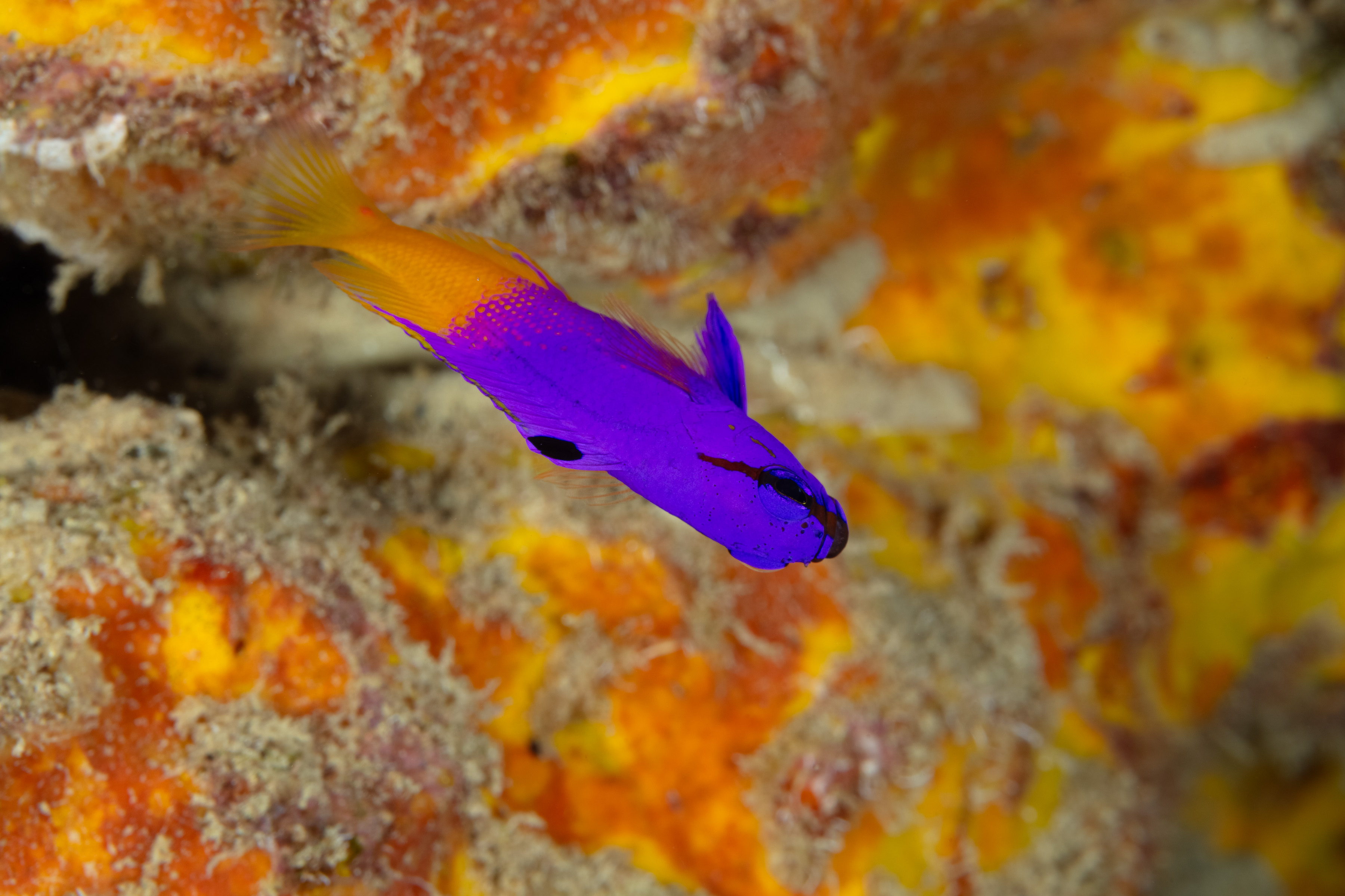 The Fairy Basslet has a purple to violet front half and a bright yellow rear. A small dark spot is located at the front of its dorsal fin, and a distinct black stripe extends from its mouth to just past its eye.