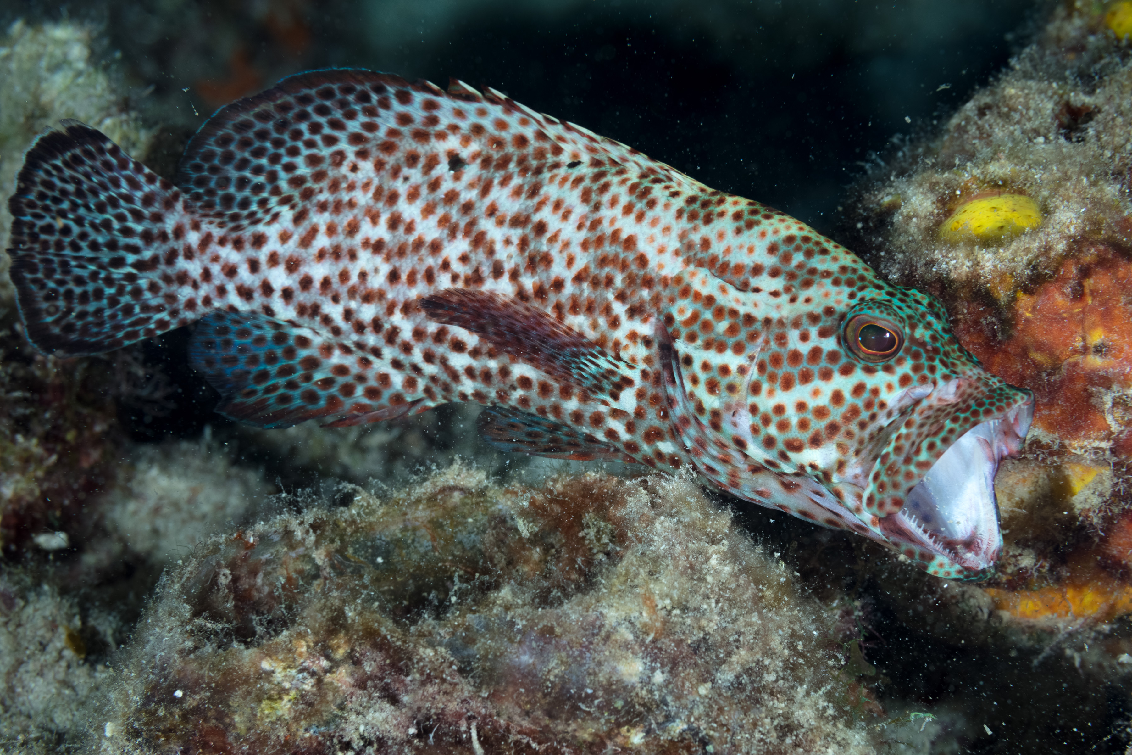 The Graysby can be seen alone near protective crevices or resting motionless on coral heads and sponges. It feeds mainly at night, with adults eating small fish such as Chromis and juveniles feeding on shrimp. It hunts by ambushing its prey, waiting until a smaller creature swims by. The Graysby begins life as a female and later changes into a male, with the male defending a territory that includes several females. It is known for aggressive mouth-to-mouth clashes, especially between males, which can precede spawning during the afternoon. It can live up to 13 years.