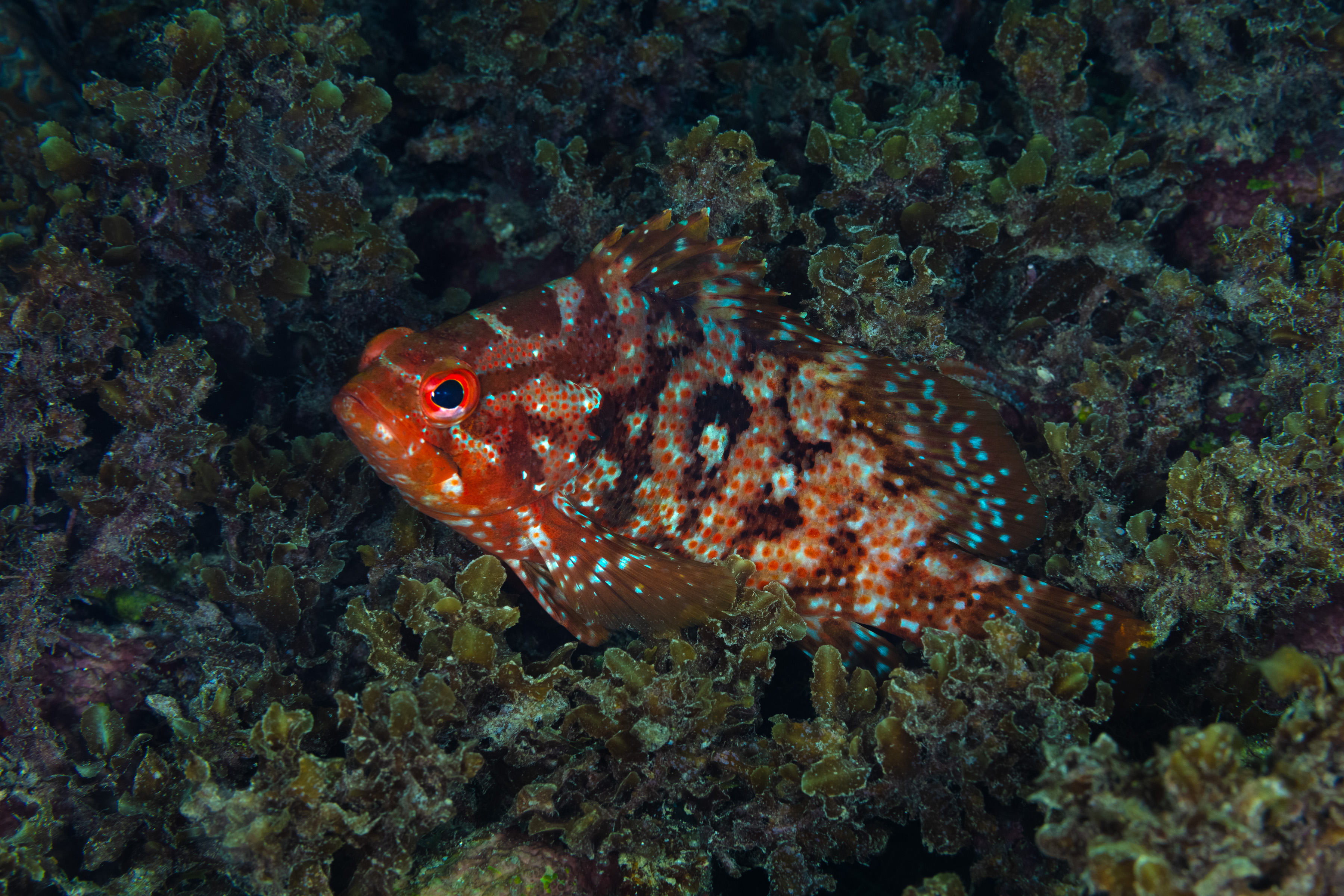 The Mutton Hamlet has a marbled body with a mix of olive to reddish-brown, often with faint bars and a dense covering of orange or red spots. Its fins also display scattered pale spots, which can sometimes appear bluish. The body may also have pale white blotches and small dark dots.