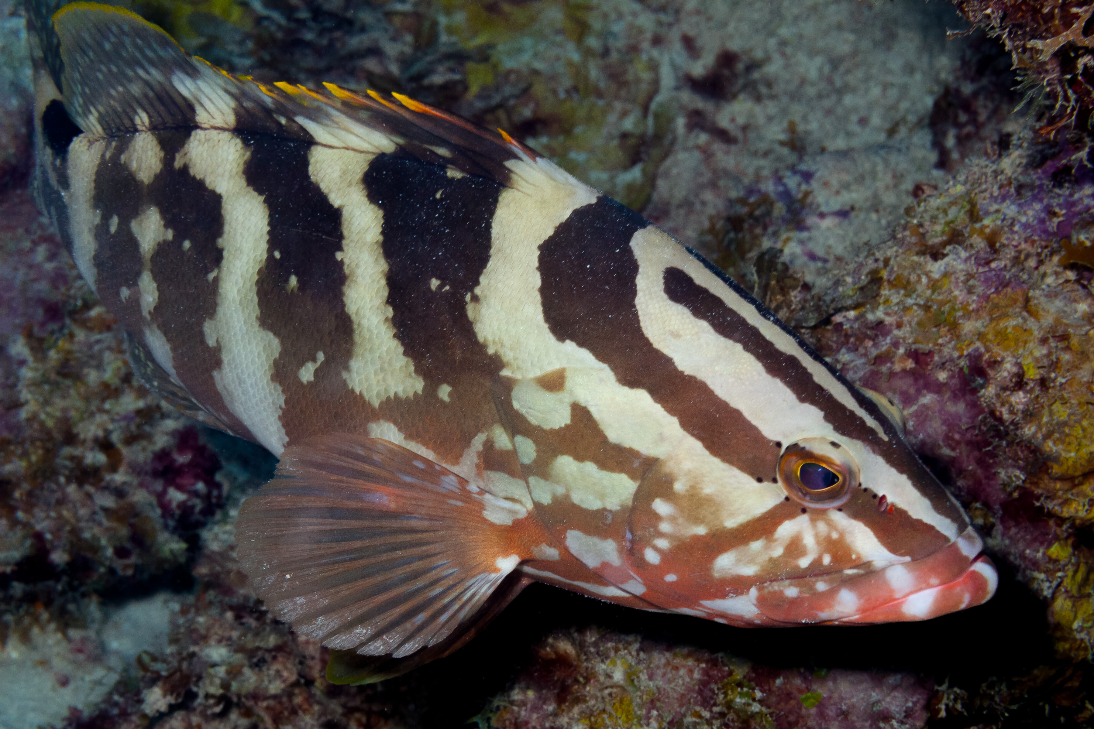 The Nassau Grouper has a light-colored body with irregular reddish-brown to olive bars and a diagonal band running from the snout, across the eye, to the dorsal fin. It also has a black, saddle-shaped mark at the base of the tail. It can change color to match its surroundings, ranging from pale, nearly white to dark reddish-brown.