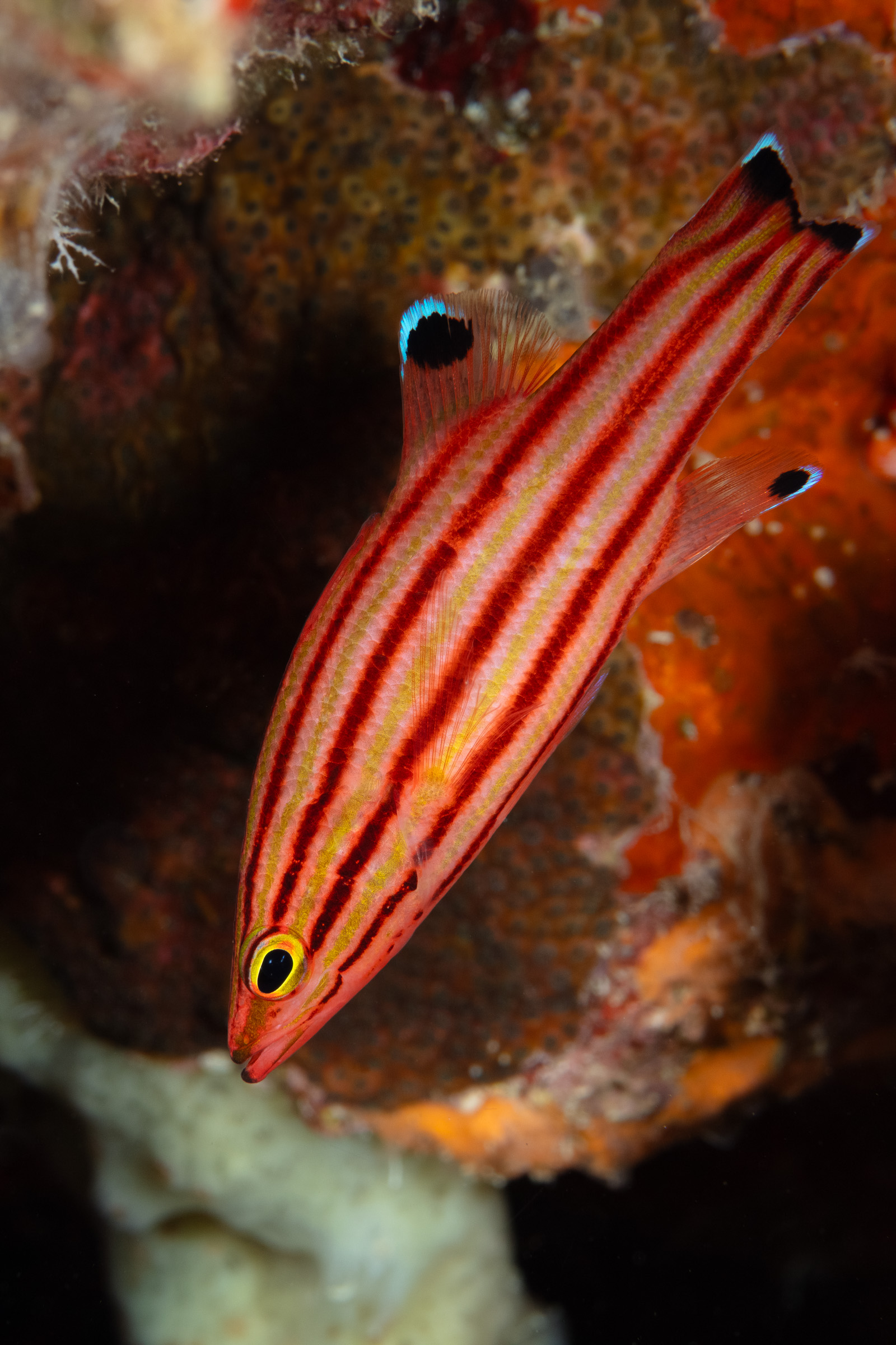 The Peppermint Basslet is shy and can be seen alone in caves, under ledges and deep crevices on the reef. It feeds on small invertebrates and other tiny creatures like crustaceans. It gets its name from its striking coloration, which resembles the red-and-white striping of a peppermint candy.