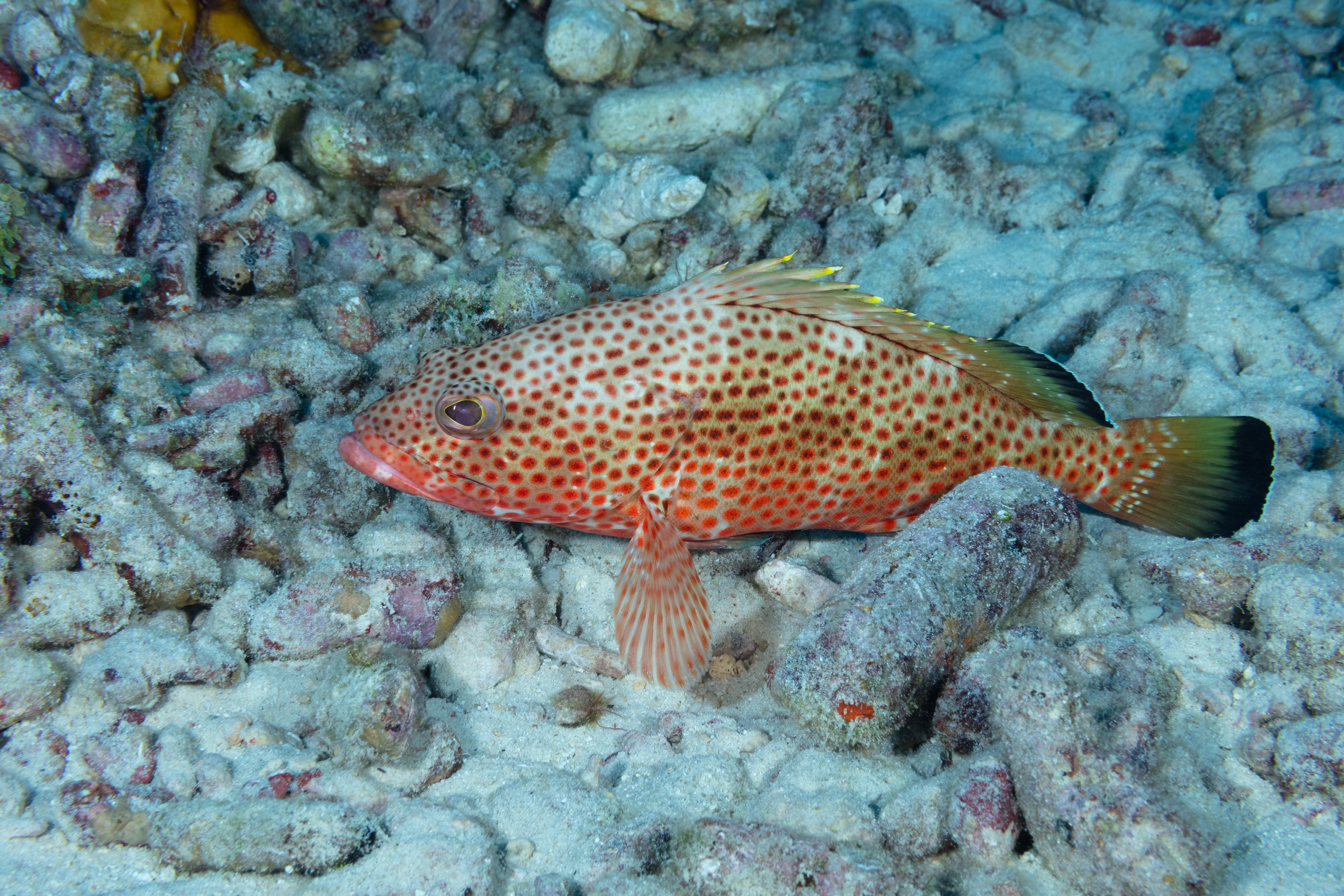 The Red Hind can be seen alone on the reef and in shallow rocky areas, where it defends its territory. It feeds on small fish, small crustaceans, octopuses, and other invertebrates. It is born female, and some later change into males as they grow. It can live for more than 20 years and is vulnerable to overfishing because it gathers in large, predictable spawning groups at the same reef sites each year.